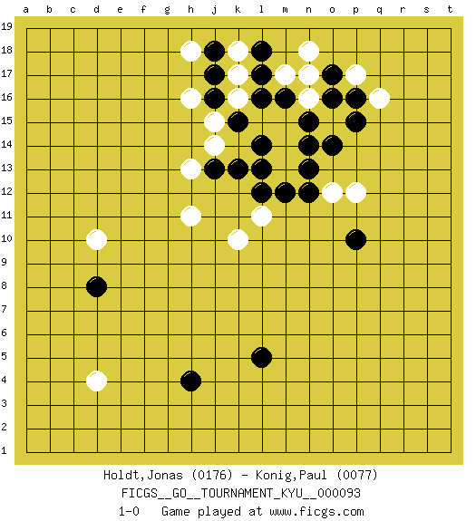 Last move : 1-0 2010 February 3 1:47:49 [Event "FICGS__GO__TOURNAMENT_KYU__000093"] [Site "FICGS"] [Date "2009.11.11"] [Round "1"] [Black "Holdt,Jonas"] [White "Konig,Paul"] [Result "1-0"] [Rating 1 "0176"] [Rating 2 "0077"] 1.n13 k10 2.p10 k16 3.d8 d4 4.k13 h11 5.l5 h13 6.h4 d10 7.j13 l15 8.p16 j14 9.l13 m13 10.m12 m14 11.l12 l11 12.n12 o12 13.n14 o15 14.l14 m15 15.n15 n16 16.m16 m17 17.k15 j15 18.l16 k17 19.o16 n17 20.l17 q16 21.p15 p17 22.o14 p12 23.o17 n18 24.j16 h16 25.j17 k18 26.j18 h18 27.l18 1-0 Here are the names of the openings (joseki) played in the four corners : Corner d4 : d8 d4 This joseki is unknown. A weak or weird move has probably been played in this corner. Corner q16 : n13 l15 This joseki is unknown. A weak or weird move has probably been played in this corner. Corner q4 : l5 1-0 This joseki is unknown. A weak or weird move has probably been played in this corner. Player Black won this Go (weiqi, baduk) game. Follow this game move after move (download)Add one stone, then sacrifice both. (Anonymous) Perception is reality. (Immanuel Kant)