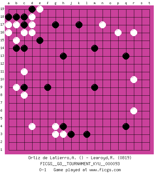 Last move : 0-1 2010 January 6 8:30:8 [Event "FICGS__GO__TOURNAMENT_KYU__000093"] [Site "FICGS"] [Date "2009.11.11"] [Round "1"] [Black "Ortiz de Latierro,Aitor"] [White "Learoyd,Ronald"] [Result "0-1"] [Rating 2 "0819"] 1.q4 d16 2.c14 d4 3.l3 r16 4.m9 p16 5.h13 r10 6.f9 c8 7.c17 c16 8.g17 d17 9.k17 n17 10.b16 b17 11.b18 a17 12.c18 b15 13.a18 a16 14.b14 d18 15.d19 e19 16.m14 h3 17.e15 c11 18.q13 r6 19.h4 g3 20.j3 g4 21.c9 b9 0-1 This go game has been lost on time (started : 2009.11.11 4:19:47) Here are the names of the openings (joseki) played in the four corners : Corner d16 : d16 c14 Hoshi (Hwajeom, Seongjeom, Xingwei`) 4-4 Point. The star or hoshi (4-4) point, emphasizing influence at the potential expense of territory. Ikken Kakari (Hankan Keolch'im, Yi Gua`jiao~, 1-Space Low Approach). Black 2 is the standard approach move to the 4-4. Corner d4 : d4 f9 Hoshi (Hwajeom, Seongjeom, Xingwei`) 4-4 Point. The star or hoshi (4-4) point, emphasizing influence at the potential expense of territory. Player White won this Go (weiqi, baduk) game. Follow this game move after move (download)Don't make empty triangles. (Anonymous) The modern world has divided itself into Conservatives and Progressives. The business of Progressives is to go on making mistakes. The business of the Conservatives is to prevent the mistakes from being corrected. (G.K. Chesterton)