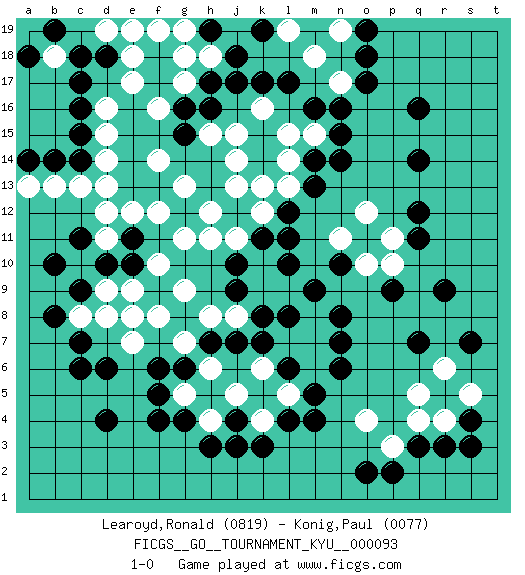 Last move : 1-0 2010 March 22 5:55:13 [Event "FICGS__GO__TOURNAMENT_KYU__000093"] [Site "FICGS"] [Date "2009.11.11"] [Round "1"] [Black "Learoyd,Ronald"] [White "Konig,Paul"] [Result "1-0"] [Rating 1 "0819"] [Rating 2 "0077"] 1.q16 k10 2.q3 k4 3.c16 f14 4.d4 d13 5.r9 e17 6.k17 d16 7.c15 d15 8.c14 c13 9.c17 d19 10.c18 c19 11.d18 e18 12.b19 f19 13.m4 b13 14.b14 a13 15.a14 d14 16.c6 g11 17.h3 j5 18.f4 g7 19.c9 e8 20.d10 g9 21.o17 f10 22.e11 f12 23.q14 g13 24.m9 l7 25.n7 h4 26.j3 d11 27.c11 d12 28.e10 e9 29.k3 l5 30.m5 k6 31.l11 k12 32.l12 l13 33.m13 l14 34.m14 l15 35.m16 k16 36.j17 j15 37.h16 h15 38.g16 f16 39.g15 g17 40.h17 h18 41.j18 j19 42.k19 g19 43.l17 l19 44.h19 g18 45.k11 j11 46.j12 k13 47.j10 h11 48.j9 k9 49.k8 j8 50.l8 m8 51.n8 m7 52.n6 m6 53.g4 g5 54.f5 h6 55.f6 e7 56.d6 b18 57.e19 d19 58.l4 j13 59.j7 h8 60.k7 l9 61.l10 h12 62.l6 e19 63.a18 m18 64.o18 n19 65.o19 n17 66.n16 e12 67.j4 c8 68.b8 d9 69.c7 d8 70.b10 m15 71.n15 o12 72.q12 p11 73.q11 n11 74.n14 j14 75.g6 f8 76.h7 o10 77.p9 s5 78.s7 r6 79.s3 r4 80.r3 q5 81.q7 p10 82.n10 q4 83.s4 p3 84.p2 o4 85.o2 1-0 Here are the names of the openings (joseki) played in the four corners : Corner d16 : c16 f14 Komoku (Somok, Xiao~mu`) 3-4 Point. The komoku (3-4) point is the traditional corner enclosure move.. Player Black won this Go (weiqi, baduk) game. Follow this game move after move (download)Extend one hand from the cutting points. (Anonymous) I take risks, sometimes patients die, but not taking risks causes more patients to die. So I guess my biggest problem is I've been cursed with the ability to do the math. (Gregory House, House M.D.)