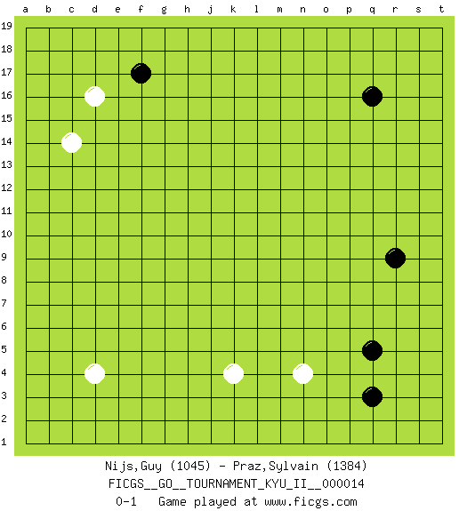 Last move : 0-1 2009 December 19 19:53:56 [Event "FICGS__GO__TOURNAMENT_KYU_II__000014"] [Site "FICGS"] [Date "2009.11.14"] [Round "1"] [Black "Nijs,Guy"] [White "Praz,Sylvain"] [Result "0-1"] [Rating 1 "1045"] [Rating 2 "1384"] 1.q16 d16 2.q3 d4 3.r9 n4 4.q5 k4 5.f17 c14 0-1 This go game has been lost on time (started : 2009.11.14 0:49:24) Here are the names of the openings (joseki) played in the four corners : Corner d16 : d16 f17 Hoshi (Hwajeom, Seongjeom, Xingwei`) 4-4 Point. The star or hoshi (4-4) point, emphasizing influence at the potential expense of territory. Ikken Kakari (Hankan Keolch'im, Yi Gua`jiao~, 1-Space Low Approach). Black 2 is the standard approach move to the 4-4. Corner d4 : d4 0-1 Hoshi (Hwajeom, Seongjeom, Xingwei`) 4-4 Point. The star or hoshi (4-4) point, emphasizing influence at the potential expense of territory. Player White won this Go (weiqi, baduk) game. Follow this game move after move (download)... {it is} something unearthly... if there are sentient beings on other planets, then they play go. (Emanuel Lasker, chess world champion) There is a great deal of difference between an eager man who wants to read a book and a tired man who wants a book to read. (G.K. Chesterton)