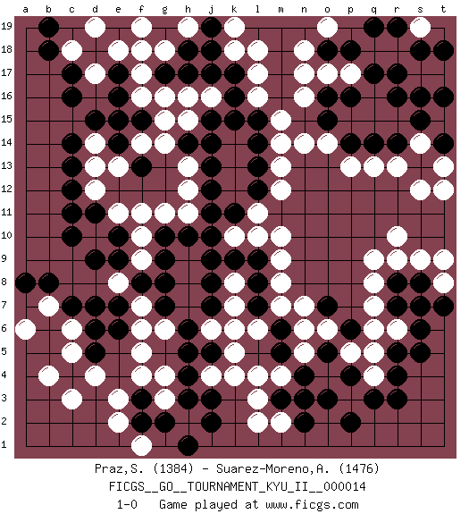 Last move : 1-0 2009 December 5 23:6:33 [Event "FICGS__GO__TOURNAMENT_KYU_II__000014"] [Site "FICGS"] [Date "2009.11.14"] [Round "1"] [Black "Praz,Sylvain"] [White "Suarez-Moreno,Alejandro"] [Result "1-0"] [Rating 1 "1384"] [Rating 2 "1476"] 1.r16 d4 2.q3 d17 3.d15 f16 4.c17 c18 5.c16 d16 6.c13 r10 7.r8 q5 8.r5 q4 9.r4 p3 10.r3 q7 11.r7 o4 12.j3 r13 13.f3 e3 14.d6 c6 15.d5 c5 16.c7 f4 17.d7 p17 18.q17 n16 19.p16 o17 20.k17 l17 21.g17 g16 22.h17 g3 23.f2 e2 24.g2 h2 25.h3 g4 26.j2 l3 27.j5 g6 28.m3 k4 29.h5 k5 30.j7 d10 31.c10 d12 32.c12 d13 33.d11 e11 34.c11 f11 35.m5 m4 36.n4 l4 37.n3 n5 38.m6 m2 39.n2 l2 40.o5 n6 41.p2 k7 42.g7 r6 43.p6 o6 44.o3 p5 45.p4 m7 46.o5 q6 47.o7 n7 48.j15 s17 49.s16 q18 50.r17 r18 51.s18 s19 52.t18 s14 53.q14 q13 54.p14 p13 55.r14 o14 56.o15 n14 57.s6 q8 58.e15 f14 59.e16 f17 60.e17 g14 61.j13 h12 62.s15 q9 63.j12 l11 64.l13 m13 65.j10 k10 66.k11 l10 67.j9 k8 68.g9 f9 69.f8 l16 70.k16 e18 71.d18 g18 72.h18 d19 73.b18 d17 74.s8 s9 75.e10 h19 76.f18 f19 77.j19 l18 78.g19 f1 79.h1 h19 80.k6 l6 81.g19 j6 82.h6 h19 83.f15 g15 84.g19 j4 85.h4 h19 86.c4 c3 87.g19 b4 88.f18 t17 89.t16 g18 90.l12 m12 91.f18 f10 92.e9 g18 93.k9 h19 94.l9 m9 95.g19 m10 96.f18 e8 97.d9 g18 98.p18 h19 99.o18 n18 100.g19 f18 101.q19 h11 102.j11 f7 103.g8 f6 104.e7 b7 105.b8 a6 106.s13 s12 107.t14 t12 108.o16 n17 109.l14 m15 110.a8 d14 111.c14 t8 112.t7 t9 113.s5 r9 114.s7 k18 115.e6 f5 116.e14 e13 117.l8 m8 118.l7 k6 119.j8 h19 120.j18 h16 121.l15 m14 122.g10 g11 123.b19 j16 124.j17 k19 125.k15 h13 126.h14 h15 127.j14 o19 128.r19 t13 129.h10 s14 130.f13 1-0 Here are the names of the openings (joseki) played in the four corners : Corner d16 : d17 d15 Komoku (Somok, Xiao~mu`) 3-4 Point. The komoku (3-4) point is the traditional corner enclosure move.. Ikken Takagakari (Hankan Nop'dakeolch'im, Yi Gaogua`jiao~, 1-Space High Approach). The 5-4 approach move has become more popular in modern times, as modern Go emphasizes speed and influence. Corner d4 : d4 j3 Hoshi (Hwajeom, Seongjeom, Xingwei`) 4-4 Point. The star or hoshi (4-4) point, emphasizing influence at the potential expense of territory. Corner q16 : r16 r13 Komoku (Somok, Xiao~mu`) 3-4 Point. The komoku (3-4) point is the traditional corner enclosure move.. Player Black won this Go (weiqi, baduk) game. Follow this game move after move (download)In the opening, when you don't know what to play, make a shimari. (Jansteen) Players are not good because they find tactics, it is about the way to find the positions in which those tactics are hidden. (Luc-Olivier Leclerc)
