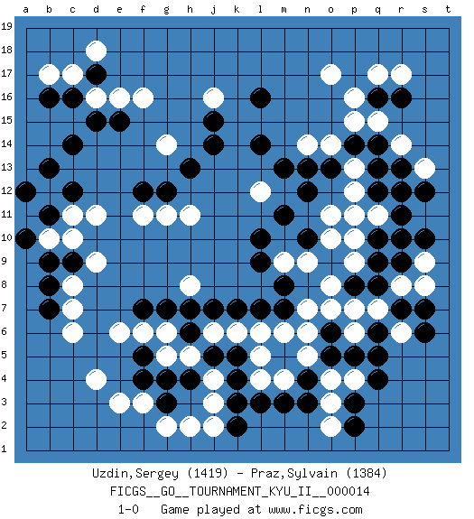Last move : 1-0 2010 January 10 20:12:45 [Event "FICGS__GO__TOURNAMENT_KYU_II__000014"] [Site "FICGS"] [Date "2009.11.14"] [Round "1"] [Black "Uzdin,Sergey"] [White "Praz,Sylvain"] [Result "1-0"] [Rating 1 "1419"] [Rating 2 "1384"] 1.q16 d16 2.q4 d4 3.q10 o17 4.l16 r17 5.r16 q17 6.k3 p16 7.q14 p15 8.p14 j16 9.c14 d11 10.c16 c17 11.d17 b17 12.d15 e16 13.l14 o14 14.b16 d18 15.e15 f16 16.b11 l4 17.l3 m4 18.m3 l12 19.j14 g14 20.c9 b12 21.c12 c11 22.b13 b10 23.a12 c8 24.b9 c10 25.a10 d9 26.b8 c7 27.b7 c6 28.h13 h11 29.g12 g11 30.f12 f11 31.f4 f3 32.g3 e3 33.h4 g5 34.f5 g2 35.g4 j2 36.n4 m6 37.o6 j3 38.k4 j4 39.j5 h5 40.k2 h2 41.h6 g6 42.g7 f6 43.f7 e6 44.j7 h8 45.h7 k6 46.k5 l5 47.l7 l6 48.m7 n7 49.k7 n6 50.m11 o8 51.q8 m9 52.l10 j6 53.l9 o11 54.o13 q15 55.n12 p13 56.q13 p12 57.q12 p11 58.m13 p6 59.o5 n5 60.n10 o4 61.n3 p4 62.p3 o3 63.p5 o2 64.q6 p7 65.p2 q7 66.r7 r6 67.q5 r8 68.p8 o7 69.s7 s8 70.s6 q11 71.r11 r10 72.r9 p9 73.q9 s9 74.s10 p10 75.r10 r12 76.s12 r14 77.r13 s13 78.r12 n9 79.m8 n14 80.n13 o10 81.j15 1-0 Here are the names of the openings (joseki) played in the four corners : Corner q16 : q16 o17 Hoshi (Hwajeom, Seongjeom, Xingwei`) 4-4 Point. The star or hoshi (4-4) point, emphasizing influence at the potential expense of territory. Ikken Kakari (Hankan Keolch'im, Yi Gua`jiao~, 1-Space Low Approach). White 2 is the standard approach move to the 4-4. Corner q4 : q4 l4 Hoshi (Hwajeom, Seongjeom, Xingwei`) 4-4 Point. The star or hoshi (4-4) point, emphasizing influence at the potential expense of territory. Corner d4 : d4 c9 Hoshi (Hwajeom, Seongjeom, Xingwei`) 4-4 Point. The star or hoshi (4-4) point, emphasizing influence at the potential expense of territory. Player Black won this Go (weiqi, baduk) game. Follow this game move after move (download)The simplest move is the best move. (Anonymous) I have opinions of my own - strong opinions - but I don't always agree with them. (George Bush)