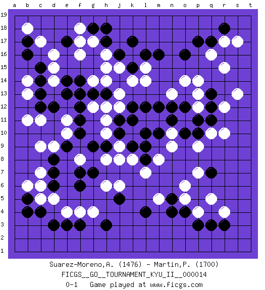 Last move : 0-1 2010 April 19 9:17:38 [Event "FICGS__GO__TOURNAMENT_KYU_II__000014 "] [Site "FICGS"] [Date "2009.11.14"] [Round "1"] [Black "Suarez-Moreno,Alejandro "] [White "Martin,Pete "] [Result "0-1"] [Rating 1 "1476"] [Rating 2 "1700"] 1.q17 c5 2.q3 d16 3.d3 e4 4.e3 f4 5.f3 g4 6.h3 q5 7.c14 c11 8.e14 f16 9.d12 d9 10.b16 c17 11.c12 b11 12.f11 r15 13.o16 r17 14.r18 q16 15.p17 s17 16.h17 g17 17.k17 h16 18.j16 h15 19.e17 f17 20.g18 f18 21.h18 j15 22.k15 r10 23.o4 r4 24.q13 p14 25.q11 r12 26.q12 s13 27.q7 q10 28.o12 o14 29.p10 p9 30.o10 p4 31.p3 p7 32.j5 o5 33.n4 n9 34.m10 n10 35.n11 p13 36.f7 p12 37.p11 m11 38.m12 l11 39.l12 l14 40.k12 k14 41.m16 l15 42.l16 n13 43.n12 h12 44.j11 h11 45.l10 j9 46.j10 h10 47.k9 j8 48.g9 k8 49.l8 l7 50.k11 m8 51.l9 m5 52.n5 o6 53.l4 h6 54.c4 d5 55.b5 b6 56.b4 b13 57.c13 b14 58.c15 f13 59.f14 d15 60.g13 g12 61.f12 g14 62.h13 j13 63.e13 j6 64.d7 c7 65.d8 c9 66.e9 e10 67.f10 e11 68.h9 h14 69.f13 j12 70.b17 b18 71.r3 d14 72.g7 f8 73.d6 c6 74.f6 h8 0-1 This go game has been lost on time (started : 2009.11.14 0:49:24) Here are the names of the openings (joseki) played in the four corners : Corner d4 : c5 d3Mokuhazushi (Waemok, Wai`mu`) 5-3 Point. The mokuhazushi (5-3) point was popular in the Edo period in Japan (1600 - 1867). It emphasizes influence; territorially, it is inferior to the 3-4 point.Komoku Kakari. Black 2 is the standard approach because of its solidity and stability. Corner q4 : q3 q5Komoku (Somok, Xiao~mu`) 3-4 Point. The komoku (3-4) point is the traditional corner enclosure move..Ikken Takagakari (Hankan Nop'dakeolch'im, Yi Gaogua`jiao~, 1-Space High Approach). The 5-4 approach move has become more popular in modern times, as modern Go emphasizes speed and influence. Corner d16 : d16 c14Hoshi (Hwajeom, Seongjeom, Xingwei`) 4-4 Point. The star or hoshi (4-4) point, emphasizing influence at the potential expense of territory.Ikken Kakari (Hankan Keolch'im, Yi Gua`jiao~, 1-Space Low Approach). Black 2 is the standard approach move to the 4-4. Corner q16 : q17 r15Komoku (Somok, Xiao~mu`) 3-4 Point. The komoku (3-4) point is the traditional corner enclosure move..Ikken Kakari (Hankan Keolch'im, Yi Gua`jiao~, 1-Space Low Pincer). The small knight move is the basic approach move to the 3-4 point stone. It has been continually used for over four centuries. There are limitless variations, with new moves constantly being discovered. White 2 opens the door to a treaure store of joseki. Player White won this Go (weiqi, baduk) game.Follow this game move after move (download ) Territory really exists only in the end. (Pierre Audouard) Live, lose, and learn, by observing your opponent how to win. (Amber Steenbock)