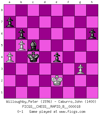 Last move : 0-1 2006 October 17 13:10:36 [Event "FICGS__CHESS__RAPID_B__000018"] [Site "FICGS"] [Date "2006.10.03"] [Round "1"] [White "Willoughby,Peter"] [Black "Caburro,John"] [Result "0-1"] [WhiteElo "1596"] [BlackElo "1400"] 1.e4 g6 2.d4 Bg7 3.Nf3 d6 4.c3 b6 5.Be3 Bb7 6.Bd3 Nd7 7.O-O e6 8.Nbd2 Ne7 9.Bb5 O-O 10.Bxd7 Qxd7 11.e5 Rad8 12.exd6 cxd6 13.Rb1 f5 14.Bg5 h6 15.Bxe7 Qxe7 16.a4 g5 17.b4 g4 18.Ne1 e5 19.dxe5 dxe5 20.Qb3+ Kh8 21.b5 Rxd2 22.g3 f4 23.Rb2 Rxb2 24.Qxb2 fxg3 25.fxg3 Qc5+ 26.Rf2 Qe3 27.Ng2 Bxg2 28.Kxg2 Rxf2+ 29.Qxf2 Qxf2+ 30.Kxf2 Kg8 31.c4 Bf8 32.Ke3 Kf7 33.Kf2 Ke6 34.Kg2 e4 35.h3 gxh3+ 36.Kxh3 Ke5 37.Kg2 Kd4 38.Kf2 Bc5 39.Ke2 Kxc4 0-1 Robatsch defense : Geller's system Kingside Castling by player White (move 7) Kingside Castling by player Black (move 9) 10 pieces endgame at move 39 : White KPPP , Black KBPPPP WHITE : King + 3 Pawns BLACK : King + 1 Bishop 4 Pawns Player Black won this chess game. Follow this game move after move (download)What is the object of playing a gambit opening?... To acquire a reputation of being a dashing player at the cost of losing a game. (Siegbert Tarrasch) Schach ist gnadenlos. Du mußt bereit sein zu töten. (Nigel Short) Después de la respuesta de las negras a 1.e4 con 1..e5, se quedan siempre tratando de entrar dentro del juego. (Howard Staunton) Le jeu d'échecs est comme rejeté hors du temps. (Antoine de Saint-Exupéry) All war is based on deception. (Sun Tzu)