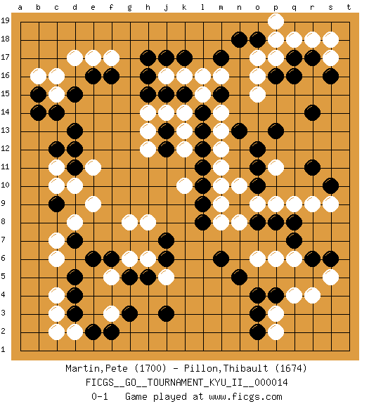 Last move : 0-1 2010 January 16 0:34:15 [Event "FICGS__GO__TOURNAMENT_KYU_II__000014"] [Site "FICGS"] [Date "2009.11.14"] [Round "1"] [Black "Martin,Pete"] [White "Pillon,Thibault"] [Result "0-1"] [Rating 1 "1700"] [Rating 2 "1674"] 1.q16 d17 2.d4 q4 3.d15 c15 4.c14 c16 5.d13 f17 6.c9 o17 7.r14 k16 8.m17 o15 9.m15 q18 10.r17 r18 11.n18 s17 12.s16 s18 13.r6 r9 14.r11 r4 15.q8 q9 16.p8 p9 17.o8 p11 18.o3 p3 19.o4 s5 20.s6 f3 21.j3 c3 22.d3 c4 23.d5 d2 24.e2 c2 25.f2 c6 26.e6 j5 27.h5 h6 28.j6 g6 29.g5 f5 30.g3 e9 31.f6 g8 32.j7 h8 33.p13 m10 34.l8 k10 35.q17 p17 36.o18 p18 37.p16 o16 38.n13 p19 39.o10 c11 40.d11 d10 41.c12 e11 42.d12 c10 43.d7 c7 44.o11 k14 45.e16 e17 46.b14 m8 47.l9 m9 48.l10 q6 49.q7 m11 50.l11 m12 51.m6 o9 52.n9 n10 53.o12 n8 54.l12 m13 55.l13 m14 56.l14 l15 57.k17 m16 58.h17 d8 59.b15 b16 60.j15 k13 61.k15 l16 62.j12 j16 63.j17 h13 64.j13 j14 65.h15 h14 66.h16 h12 67.f16 p6 68.p4 p2 69.o2 o6 70.s10 s9 71.n5 k12 0-1 Here are the names of the openings (joseki) played in the four corners : Corner d16 : d17 d15 Komoku (Somok, Xiao~mu`) 3-4 Point. The komoku (3-4) point is the traditional corner enclosure move.. Ikken Takagakari (Hankan Nop'dakeolch'im, Yi Gaogua`jiao~, 1-Space High Approach). The 5-4 approach move has become more popular in modern times, as modern Go emphasizes speed and influence. Corner q16 : q16 o17 Hoshi (Hwajeom, Seongjeom, Xingwei`) 4-4 Point. The star or hoshi (4-4) point, emphasizing influence at the potential expense of territory. Ikken Kakari (Hankan Keolch'im, Yi Gua`jiao~, 1-Space Low Approach). White 2 is the standard approach move to the 4-4. Corner q4 : q4 r6 Hoshi (Hwajeom, Seongjeom, Xingwei`) 4-4 Point. The star or hoshi (4-4) point, emphasizing influence at the potential expense of territory. Ikken Kakari (Hankan Keolch'im, Yi Gua`jiao~, 1-Space Low Approach). Black 2 is the standard approach move to the 4-4. Player White won this Go (weiqi, baduk) game. Follow this game move after move (download)While the Baroque rules of chess could only have been created by humans, the rules of go are so elegant, organic, and rigorously logical that if intelligent life forms exist elsewhere in the universe, they almost certainly play go. (Edward Lasker, international chess master) The age of a woman doesn't mean a thing. The best tunes are played on the oldest fiddles. (Ralph Waldo Emerson)