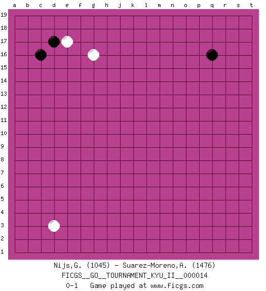 Last move : 0-1 2009 December 17 7:49:0 [Event "FICGS__GO__TOURNAMENT_KYU_II__000014 "] [Site "FICGS"] [Date "2009.11.14"] [Round "1"] [Black "Nijs,Guy "] [White "Suarez-Moreno,Alejandro "] [Result "0-1"] [Rating 1 "1045"] [Rating 2 "1476"] 1.q16 d3 2.c16 e17 3.d17 g16 0-1 This go game has been lost on time (started : 2009.11.14 0:49:24) Here are the names of the openings (joseki) played in the four corners : Corner d16 : c16 e17Komoku (Somok, Xiao~mu`) 3-4 Point. The komoku (3-4) point is the traditional corner enclosure move..Ikken Kakari (Hankan Keolch'im, Yi Gua`jiao~, 1-Space Low Pincer). The small knight move is the basic approach move to the 3-4 point stone. It has been continually used for over four centuries. There are limitless variations, with new moves constantly being discovered. White 2 opens the door to a treaure store of joseki. Corner d4 : d3 0-1Komoku (Somok, Xiao~mu`) 3-4 Point. The komoku (3-4) point is the traditional corner enclosure move.. Player White won this Go (weiqi, baduk) game.Follow this game move after move (download ) At the head of two stones in a row, play hane. (Anonymous) There are more things in heaven and earth than practically anywhere else. (Unknown)