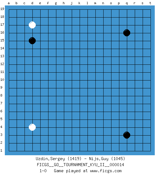 Last move : 1-0 2009 December 16 7:49:36 [Event "FICGS__GO__TOURNAMENT_KYU_II__000014"] [Site "FICGS"] [Date "2009.11.14"] [Round "1"] [Black "Uzdin,Sergey"] [White "Nijs,Guy"] [Result "1-0"] [Rating 1 "1419"] [Rating 2 "1045"] 1.q16 d4 2.q3 d17 3.d15 1-0 This go game has been lost on time (started : 2009.11.14 0:49:24) Here are the names of the openings (joseki) played in the four corners : Corner d16 : d17 d15 Komoku (Somok, Xiao~mu`) 3-4 Point. The komoku (3-4) point is the traditional corner enclosure move.. Ikken Takagakari (Hankan Nop'dakeolch'im, Yi Gaogua`jiao~, 1-Space High Approach). The 5-4 approach move has become more popular in modern times, as modern Go emphasizes speed and influence. Player Black won this Go (weiqi, baduk) game. Follow this game move after move (download)Pon-nuki is worth thirty points. (Anonymous) Unless in communicating with it one says exactly what one means, trouble is bound to result. (Alan Turing, about computers)