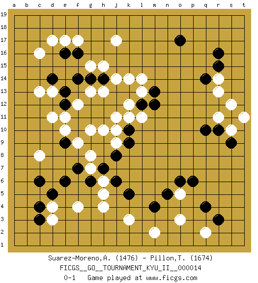 Last move : 0-1 2009 November 20 23:27:8 [Event "FICGS__GO__TOURNAMENT_KYU_II__000014"] [Site "FICGS"] [Date "2009.11.14"] [Round "1"] [Black "Suarez-Moreno,Alejandro"] [White "Pillon,Thibault"] [Result "0-1"] [Rating 1 "1476"] [Rating 2 "1674"] 1.r16 d17 2.q4 d4 3.o17 d11 4.q10 o3 5.m4 o5 6.p6 q2 7.r3 m2 8.o6 j17 9.c6 c8 10.e6 f4 11.g6 h4 12.k5 r14 13.q14 r13 14.r15 s10 15.s11 r11 16.r10 s12 17.s9 t11 18.c3 d3 19.c4 j11 20.d14 c16 21.f14 g15 22.g14 h15 23.h14 j14 24.g11 c13 25.j12 k11 26.j13 k14 27.l12 l11 28.m12 g10 29.h11 h10 30.f10 h6 31.h7 g7 32.f7 g8 33.j6 h5 34.n5 k3 35.k9 j9 36.k10 j10 37.j8 f9 38.d5 e10 39.f11 k12 40.k13 l13 41.m13 l14 42.e12 d13 43.e13 g13 44.e16 e17 45.f16 f17 46.e9 e11 47.g12 h13 48.h12 f12 0-1 Here are the names of the openings (joseki) played in the four corners : Corner q4 : q4 o3 Hoshi (Hwajeom, Seongjeom, Xingwei`) 4-4 Point. The star or hoshi (4-4) point, emphasizing influence at the potential expense of territory. Ikken Kakari (Hankan Keolch'im, Yi Gua`jiao~, 1-Space Low Approach). White 2 is the standard approach move to the 4-4. Corner d4 : d4 c6 Hoshi (Hwajeom, Seongjeom, Xingwei`) 4-4 Point. The star or hoshi (4-4) point, emphasizing influence at the potential expense of territory. Ikken Kakari (Hankan Keolch'im, Yi Gua`jiao~, 1-Space Low Approach). Black 2 is the standard approach move to the 4-4. Player White won this Go (weiqi, baduk) game. Follow this game move after move (download)The carpenter's square becomes ko. (Anonymous) Experiences are the keys to life. (Daniel Parmet)