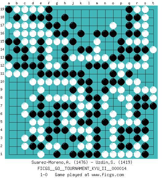 Last move : 1-0 2010 January 10 9:53:41 [Event "FICGS__GO__TOURNAMENT_KYU_II__000014"] [Site "FICGS"] [Date "2009.11.14"] [Round "1"] [Black "Suarez-Moreno,Alejandro"] [White "Uzdin,Sergey"] [Result "1-0"] [Rating 1 "1476"] [Rating 2 "1419"] 1.q17 d4 2.q4 d16 3.q11 o3 4.j3 l3 5.f3 d10 6.p3 o4 7.m3 c7 8.d2 c3 9.k16 r15 10.q14 r17 11.r18 s17 12.q16 s13 13.r13 s12 14.r16 s16 15.s14 r10 16.r8 s18 17.q18 s15 18.r14 t14 19.m4 q5 20.r4 s9 21.r6 o6 22.m6 n7 23.m7 p8 24.q9 n8 25.c14 c15 26.d12 h17 27.f17 h15 28.j17 e17 29.h16 d14 30.c13 f16 31.g17 f12 32.f6 q10 33.p10 p9 34.o11 h6 35.g7 k7 36.l8 k8 37.l9 k9 38.l10 l13 39.j15 j13 40.h14 m15 41.k14 k13 42.l14 g15 43.g16 f14 44.e11 e10 45.f11 f10 46.g11 g10 47.h11 h10 48.j11 r5 49.s5 q6 50.s7 q8 51.h13 l2 52.m2 p12 53.p13 q12 54.o13 q15 55.p15 p11 56.d6 c6 57.o10 j4 58.k3 k4 59.h4 h5 60.g4 o17 61.o16 l4 62.l5 c11 63.b15 b16 64.b14 c2 65.d3 e4 66.f4 e3 67.e2 h1 68.h2 g2 69.j1 f2 70.g1 e1 71.l1 o2 72.p2 n1 73.m1 k2 74.k1 j10 75.k11 o12 76.n12 n13 77.m12 m14 78.n16 m13 79.l12 r9 80.c17 c16 81.e18 d17 82.d18 c18 83.b18 b17 84.c19 b19 85.a19 c17 86.e15 f15 87.f18 d19 88.m16 b19 89.k5 j5 90.c19 a17 91.h7 k6 92.b12 p1 93.q2 b11 94.n9 o9 95.n10 d5 96.e7 d8 97.e8 a12 98.c12 l7 99.m8 b19 100.k10 c19 101.j9 h8 102.j7 j8 103.j6 g8 104.g6 f8 105.e6 e9 106.g5 s3 107.s4 r2 108.r3 q1 109.s2 r1 110.s1 o1 111.p4 p5 112.n5 o5 113.e13 f13 114.e14 e16 115.e12 d15 116.a13 a11 117.h18 g12 118.h12 r12 119.p14 e19 120.f19 r19 121.q19 s19 122.s8 q7 123.r7 t8 124.t7 t9 125.l6 e5 126.a15 1-0 Here are the names of the openings (joseki) played in the four corners : Corner q4 : q4 o3 Hoshi (Hwajeom, Seongjeom, Xingwei`) 4-4 Point. The star or hoshi (4-4) point, emphasizing influence at the potential expense of territory. Ikken Kakari (Hankan Keolch'im, Yi Gua`jiao~, 1-Space Low Approach). White 2 is the standard approach move to the 4-4. Corner d4 : d4 j3 Hoshi (Hwajeom, Seongjeom, Xingwei`) 4-4 Point. The star or hoshi (4-4) point, emphasizing influence at the potential expense of territory. Corner d16 : d16 c14 Hoshi (Hwajeom, Seongjeom, Xingwei`) 4-4 Point. The star or hoshi (4-4) point, emphasizing influence at the potential expense of territory. Ikken Kakari (Hankan Keolch'im, Yi Gua`jiao~, 1-Space Low Approach). Black 2 is the standard approach move to the 4-4. Player Black won this Go (weiqi, baduk) game. Follow this game move after move (download)Every move brings change. (Pierre Audouard) Question: Is 'This statement is paradoxical' a paradoxical statement ? Or is it a meta-paradox ? (Normajean Yates)