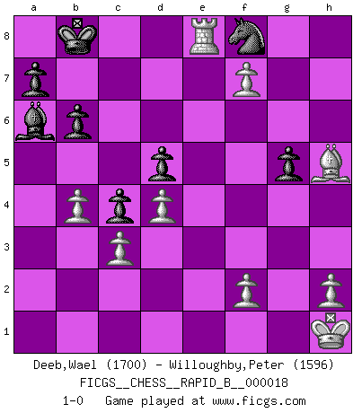 Last move : 1-0 2006 November 29 21:16:42 [Event "FICGS__CHESS__RAPID_B__000018"] [Site "FICGS"] [Date "2006.10.03"] [Round "1"] [White "Deeb,Wael"] [Black "Willoughby,Peter"] [Result "1-0"] [WhiteElo "1700"] [BlackElo "1596"] 1.e4 e6 2.d4 d5 3.e5 c5 4.c3 Nc6 5.Nf3 Qb6 6.a3 c4 7.Nbd2 Na5 8.Be2 Bd7 9.O-O O-O-O 10.b4 Nc6 11.a4 Qc7 12.Nb1 Nge7 13.Na3 Nf5 14.Bg5 Be7 15.Nb5 Qb8 16.Bxe7 Ncxe7 17.g4 Nh6 18.Nd6+ Kc7 19.g5 Nhf5 20.Nxf7 Rhf8 21.Nxd8 Qxd8 22.a5 Kb8 23.a6 b6 24.Kh1 h6 25.gxh6 Nxh6 26.Qd2 Nhf5 27.Rg1 Bb5 28.Ng5 Qd7 29.Nh3 Qd8 30.Nf4 Qc8 31.Rg5 Rh8 32.Rh5 g6 33.Rxh8 Qxh8 34.Nxe6 Ng7 35.Nxg7 Qxg7 36.Qf4 g5 37.Qf6 Qxf6 38.exf6 Ng6 39.Rg1 Nf4 40.f7 Ne6 41.Bh5 Bxa6 42.Re1 Nf8 43.Re8+ 1-0 French : Advance, Paulsen attack Kingside Castling by player White (move 9) Queenside Castling by player Black (move 9) Player White won this chess game. Follow this game move after move (download)After a bad opening, there is hope for the middle game. After a bad middle game, there is hope for the endgame. But once you are in the endgame, the moment of truth has arrived. (Edmar Mednis) Schach wird sich dank seiner hohen kulturellen Tradition immer durchsetzen. In näherer Zukunft womöglich sogar als Gegenreaktion auf die maßlose Reizüberflutung im Freizeit- und Spielbereich. (Garry Kasparov) El Ajedrez es tortura mental. (Garry Kasparov) La conception d'un plan est le processus par lequel un joueur exploite les avantages de sa position tout en s'efforçant d'en réduire au minimum les inconvénients. Afin de garantir le succès, un plan doit toujours se fonder sur un diagnostic objectif des particularités d'une position. La conception d'un plan est d'autant plus difficile que la position est équilibrée, et grandement facilitée lorsqu'il n'existe qu'un seul plan susceptible de répondre aux exigences de la position. (Harry Golombek) If you have any trouble condescending, find a Unix user to show you how it's done. (Scott Adams)