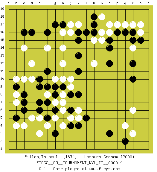 Last move : 0-1 2009 November 18 16:21:34 [Event "FICGS__GO__TOURNAMENT_KYU_II__000014"] [Site "FICGS"] [Date "2009.11.14"] [Round "1"] [Black "Pillon,Thibault"] [White "Lamburn,Graham"] [Result "0-1"] [Rating 1 "1674"] [Rating 2 "2000"] 1.q16 q4 2.d16 c4 3.j4 e3 4.o3 r6 5.g3 d10 6.k16 c14 7.f16 r14 8.r12 r17 9.r16 q17 10.p16 s16 11.s15 s17 12.r15 o17 13.m17 n18 14.m18 p17 15.r10 o16 16.o15 n15 17.o14 n16 18.c16 h16 19.h17 j17 20.g17 j16 21.k15 k17 22.m16 m15 23.l16 h14 24.k13 m12 25.k11 f14 26.c8 c10 27.c6 e5 28.e7 g5 29.j6 g7 30.b5 b4 31.b9 b10 32.e9 k5 33.k4 j5 34.l5 k6 35.q2 r3 36.o12 g10 37.e10 d12 38.e6 b7 39.g9 f8 40.f9 h10 41.h9 j10 42.k8 j9 43.j8 h8 44.c7 b8 45.g8 h7 46.f7 d5 47.f11 h12 48.h5 h4 49.f5 f4 50.g6 h6 0-1 Here are the names of the openings (joseki) played in the four corners : Corner d4 : c4 j4 Komoku (Somok, Xiao~mu`) 3-4 Point. The komoku (3-4) point is the traditional corner enclosure move.. Corner q4 : q4 o3 Hoshi (Hwajeom, Seongjeom, Xingwei`) 4-4 Point. The star or hoshi (4-4) point, emphasizing influence at the potential expense of territory. Ikken Kakari (Hankan Keolch'im, Yi Gua`jiao~, 1-Space Low Approach). Black 2 is the standard approach move to the 4-4. Corner d16 : d16 c14 Hoshi (Hwajeom, Seongjeom, Xingwei`) 4-4 Point. The star or hoshi (4-4) point, emphasizing influence at the potential expense of territory. Ikken Kakari (Hankan Keolch'im, Yi Gua`jiao~, 1-Space Low Approach). White 2 is the standard approach move to the 4-4. Corner q16 : q16 r14 Hoshi (Hwajeom, Seongjeom, Xingwei`) 4-4 Point. The star or hoshi (4-4) point, emphasizing influence at the potential expense of territory. Ikken Kakari (Hankan Keolch'im, Yi Gua`jiao~, 1-Space Low Approach). White 2 is the standard approach move to the 4-4. Player White won this Go (weiqi, baduk) game. Follow this game move after move (download)In opponents' sphere of influence, avoid sharp conflict, don't move too deep. (Otake Hideo, 9p) I believe in luck. How else can you explain the success of those you dislike ? (Jean Cocteau)