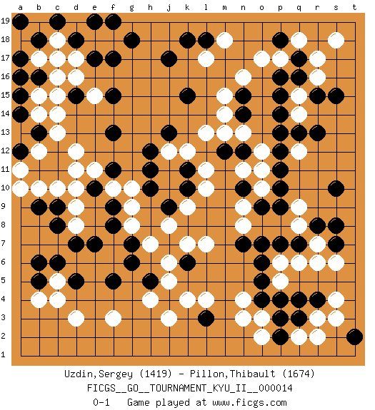 Last move : 0-1 2009 December 5 11:54:27 [Event "FICGS__GO__TOURNAMENT_KYU_II__000014"] [Site "FICGS"] [Date "2009.11.14"] [Round "1"] [Black "Uzdin,Sergey"] [White "Pillon,Thibault"] [Result "0-1"] [Rating 1 "1419"] [Rating 2 "1674"] 1.q17 d16 2.q4 d3 3.d5 c5 4.c6 c4 5.d7 f3 6.c11 q15 7.r13 r17 8.q16 r16 9.r15 q18 10.p15 q14 11.s15 o17 12.p16 s18 13.p13 o3 14.o5 r6 15.r8 r3 16.r4 s4 17.f17 c14 18.j17 l17 19.d18 c17 20.q3 s3 21.l3 j3 22.f5 n4 23.p7 l4 24.l18 m18 25.k18 d9 26.c9 d8 27.c8 d11 28.f15 d12 29.b13 b14 30.a14 b12 31.c12 c13 32.a12 c10 33.h5 k4 34.e10 d10 35.k6 p5 36.p4 q6 37.o4 n3 38.s7 s6 39.n7 j6 40.g7 j5 41.f13 l13 42.f11 l10 43.j13 m15 44.n10 k7 45.n12 j12 46.h12 k12 47.t2 q2 48.p2 r2 49.p3 o2 50.n14 m14 51.b18 c18 52.c19 e18 53.e17 d17 54.b11 b10 55.a15 b15 56.b16 b17 57.a17 l7 58.d15 c15 59.a16 e15 60.e19 d19 61.b9 a10 62.d18 f18 63.g18 d19 64.p18 p17 65.d18 p6 66.f19 a11 67.o6 c16 68.n15 b19 69.a19 b12 70.k15 g8 71.f8 g9 72.h10 h7 73.g6 n16 74.p14 q8 75.q7 r7 76.s8 q12 77.q13 q9 78.s10 n8 79.o7 n9 80.o9 o10 81.p9 n11 82.p10 o11 83.p11 o12 84.p12 n13 85.m12 m13 86.k10 k9 87.k11 l11 88.f9 g10 89.h11 h4 90.b5 b4 91.b6 f10 92.e7 e11 93.j9 j8 0-1 Here are the names of the openings (joseki) played in the four corners : Corner d4 : d3 d5 Komoku (Somok, Xiao~mu`) 3-4 Point. The komoku (3-4) point is the traditional corner enclosure move.. Ikken Takagakari (Hankan Nop'dakeolch'im, Yi Gaogua`jiao~, 1-Space High Approach). The 5-4 approach move has become more popular in modern times, as modern Go emphasizes speed and influence. Corner d16 : d16 c11 Hoshi (Hwajeom, Seongjeom, Xingwei`) 4-4 Point. The star or hoshi (4-4) point, emphasizing influence at the potential expense of territory. Corner q16 : q17 q15 Komoku (Somok, Xiao~mu`) 3-4 Point. The komoku (3-4) point is the traditional corner enclosure move.. Ikken Takagakari (Hankan Nop'dakeolch'im, Yi Gaogua`jiao~, 1-Space High Approach). The 5-4 approach move has become more popular in modern times, as modern Go emphasizes speed and influence. Corner q4 : q4 o3 Hoshi (Hwajeom, Seongjeom, Xingwei`) 4-4 Point. The star or hoshi (4-4) point, emphasizing influence at the potential expense of territory. Ikken Kakari (Hankan Keolch'im, Yi Gua`jiao~, 1-Space Low Approach). White 2 is the standard approach move to the 4-4. Player White won this Go (weiqi, baduk) game. Follow this game move after move (download)Be a little patient. Keshi works ! (Anonymous) The difference between perseverance and obstinacy is that one comes from a strong will, and the other from a strong won't. (Henry Ward Beecher)