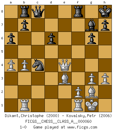Last move : 1-0 2009 December 5 19:42:13 [Event "FICGS__CHESS__CLASS_A__000060"] [Site "FICGS"] [Date "2009.11.14"] [Round "1"] [White "Dikant,Christophe"] [Black "Kovalsky,Petr"] [Result "1-0"] [WhiteElo "2000"] [BlackElo "2006"] 1.c4 Nf6 2.Nc3 g6 3.e4 d6 4.g3 Bg7 5.Bg2 O-O 6.Nge2 c5 7.O-O Nc6 8.d3 a6 9.h3 Rb8 10.a4 Ne8 11.Be3 Nc7 12.d4 cxd4 13.Nxd4 Ne6 14.Nde2 Nc5 15.Rb1 f5 16.b4 Nxe4 17.Nxe4 fxe4 18.Qd5+ Kh8 19.Nf4 Ne5 20.Ne6 Bxe6 21.Qxe6 Qc8 22.Qxe7 Nxc4 23.Qxe4 1-0 English Opening Kingside Castling by player Black (move 5) Kingside Castling by player White (move 7) Player White won this chess game. Follow this game move after move (download)Could we look into the head of a Chess player, we should see there a whole world of feelings, images, ideas, emotion and passion. (Alfred Binet) Schach ist die gewalttätigste aller Sportarten. (Garry Kasparov) Si el Ajedrez es una ciencia, es la mas inexacta. Si el Ajedrez es un arte, es demasiado inexacto para ser visto como tal. Si el Ajedrez es un deporte, es demasiado esotérico. Si el Ajedrez es un juego, es demasiado exigente para ser solo un juego. Si el Ajedrez es una aventura, es una muy demandante. Si el Ajedrez es una pasión, es una muy gratificante. Si el Ajedrez es la vida, es una muy triste. (Anónimo) Shah mat. Le roi est mort. Cri de fierté d'un joueur venant de terrasser son adversaire, courtoisement, sans effusion de sang. I find television to be very educating. Every time somebody turns on the set, I go in the other room and read a book. (Groucho Marx)