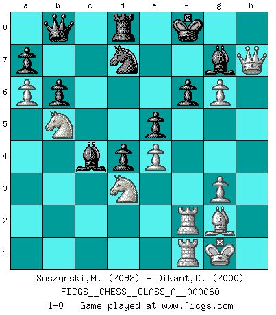 Last move : 1-0 2009 December 8 20:3:12 [Event "FICGS__CHESS__CLASS_A__000060"] [Site "FICGS"] [Date "2009.11.14"] [Round "1"] [White "Soszynski,Marek"] [Black "Dikant,Christophe"] [Result "1-0"] [WhiteElo "2092"] [BlackElo "2000"] 1.e4 g6 2.d4 Bg7 3.Nc3 c6 4.Nge2 d6 5.g3 Qc7 6.Bg2 e5 7.Be3 Nd7 8.dxe5 dxe5 9.O-O Ngf6 10.h3 O-O 11.Qd3 Nb6 12.Nc1 Be6 13.b3 Nfd7 14.a4 Rad8 15.a5 Nc8 16.Qe2 c5 17.Nb5 Qb8 18.c4 Ne7 19.Nd3 Rc8 20.Ra2 Rfd8 21.a6 b6 22.f4 f6 23.h4 Nc6 24.h5 Nd4 25.Bxd4 cxd4 26.hxg6 hxg6 27.f5 Bf7 28.fxg6 Be6 29.Qh5 Rxc4 30.bxc4 Bxc4 31.Qh7+ Kf8 32.Raf2 1-0 Robatsch defense Kingside Castling by player White (move 9) Kingside Castling by player Black (move 10) Player White won this chess game. Follow this game move after move (download)The game of chess is the touchstone of the intellect. (Goethe) Man kann eine Schachpartie nur gewinnen, wenn das Gleichgewicht gestört ist. In einer Stellung mit ungestörtem Gleichgewicht ist auch das größte Genie hilflos - in der Stellung steckt dann eben kein genialer Einfall. (Wilhelm Steinitz) Yo siempre he tenido un ligero sentimiento de lástima por una persona que no tiene conocimiento del Ajedrez. (Siegbert Tarrasch) Avec des compensations pour le matériel en plus... (Anonyme) To be champion requires more than simply being a strong player; one has to be a strong human being as well. (Anatoly Karpov)