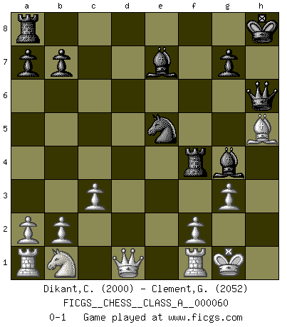 Last move : 0-1 2009 November 28 18:37:43 [Event "FICGS__CHESS__CLASS_A__000060"] [Site "FICGS"] [Date "2009.11.14"] [Round "1"] [White "Dikant,Christophe"] [Black "Clement,George"] [Result "0-1"] [WhiteElo "2000"] [BlackElo "2052"] 1.d4 e6 2.Bf4 c5 3.e3 cxd4 4.exd4 Nf6 5.Nf3 Be7 6.Bd3 Nc6 7.c3 Nh5 8.Be3 O-O 9.Ne5 Nf6 10.O-O Qc7 11.Bf4 d6 12.Nf3 e5 13.dxe5 dxe5 14.Bg3 Nh5 15.Qc2 Nxg3 16.Bxh7+ Kh8 17.hxg3 f5 18.Bg6 Qd6 19.Nxe5 Nxe5 20.Bh5 f4 21.gxf4 Rxf4 22.Qd1 Qh6 23.g3 Bg4 0-1 Queen's pawn Kingside Castling by player Black (move 8) Kingside Castling by player White (move 10) Player Black won this chess game. Follow this game move after move (download)Not all artists are Chess players, but all Chess players are artists. (Marcel Duchamp) Das Spiel gibt uns die Genugtuung, die das Leben uns versagt. (Emanuel Lasker) Repentinamente, me resultaba obvio en mi analisis que yo había pasado por alto lo que Fischer había visto en el tablero con la mas grande facilidad. (Mikhail Botvinnik) Aidez vos pièces, elles vous aideront. (Paul Morphy) You must have a dream in order to have it come true. (A.P.J. Kalam)