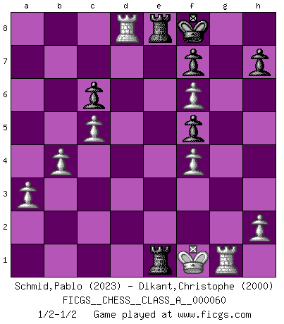 Last move : 1/2-1/2 2010 April 18 18:41:30 [Event "FICGS__CHESS__CLASS_A__000060"] [Site "FICGS"] [Date "2009.11.14"] [Round "1"] [White "Schmid,Pablo"] [Black "Dikant,Christophe"] [Result "1/2-1/2"] [WhiteElo "2023"] [BlackElo "2000"] 1.e4 d5 2.exd5 Nf6 3.d4 Bg4 4.f3 Bf5 5.g4 Bg6 6.c4 e6 7.Nc3 Bd6 8.Nge2 exd5 9.g5 Nh5 10.c5 Be7 11.Qb3 b6 12.Qxd5 Qxd5 13.Nxd5 Bd8 14.f4 Be4 15.Nxb6 axb6 16.Rg1 bxc5 17.Nc3 Bf5 18.dxc5 g6 19.Bg2 c6 20.Nb5 O-O 21.Nd6 Ng7 22.b4 Ra4 23.a3 Be6 24.Be4 Ra7 25.Bb2 Nf5 26.Bxf5 Bxf5 27.Nxf5 Re8+ 28.Kf2 gxf5 29.Rad1 Rae7 30.Be5 Nd7 31.Bf6 Re2+ 32.Kf1 Nxf6 33.gxf6 Kf8 34.Rxd8 Re1+ 35.Kf2 R1e2+ 36.Kf1 Re1+ 37.Kf2 R1e2+ 38.Kf1 Re1+ 1/2-1/2 Scandinavian defense Kingside Castling by player Black (move 20) This chess game ended in a draw. Follow this game move after move (download)If I win a tournament, I win it by myself. I do the playing. Nobody helps me. (Bobby Fischer) Die jungen Leute sollen verstehen, dass sie noch etwas von mir lernen können und müssen. (Viktor Kortschnoi) El jugador de combinación piensa hacia adelante; comienza de la posición dada y trabaja las movidas contundentes en su mente. (Emanuel Lasker) Le jeu d'échecs est comme rejeté hors du temps. (Antoine de Saint-Exupéry) Nothing is more important for teaching us to understand the concepts we have than constructing fictitious ones. (Ludwig Wittgenstein)