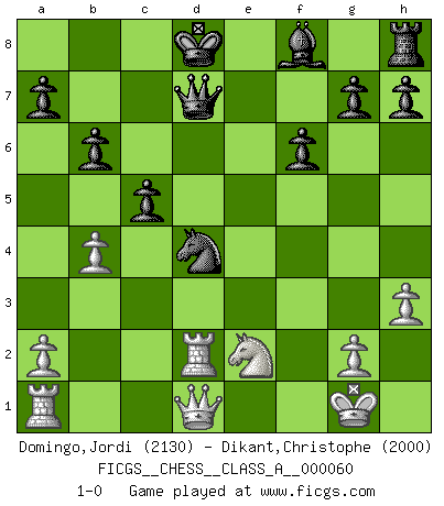 Last move : 1-0 2009 December 18 19:3:57 [Event "FICGS__CHESS__CLASS_A__000060"] [Site "FICGS"] [Date "2009.11.14"] [Round "1"] [White "Domingo,Jordi"] [Black "Dikant,Christophe"] [Result "1-0"] [WhiteElo "2130"] [BlackElo "2000"] 1.e4 d5 2.exd5 Nf6 3.d4 Bg4 4.Nf3 Qxd5 5.Be2 Nc6 6.h3 Bxf3 7.Bxf3 Qd7 8.O-O O-O-O 9.c3 e5 10.Bg5 exd4 11.Bg4 Nxg4 12.Bxd8 Nxf2 13.Rxf2 Kxd8 14.cxd4 Nxd4 15.Nc3 f6 16.Rd2 c5 17.b4 b6 18.Ne2 1-0 Scandinavian defense Kingside Castling by player White (move 8) Queenside Castling by player Black (move 8) Player White won this chess game. Follow this game move after move (download)Chess is ruthless: you've got to be prepared to kill people. (Nigel Short) Habe Mut, dich deines eigenen Verstandes zu bedienen. (Immanuel Kant) El Ajedrez era la lengua materna de Capablanca. (Reti) Que feriez-vous si vous étiez en train de jouer aux échecs et que la fin du monde arrive ? Je continuerais à jouer. (Saint Borromée) Follow your passion, and success will follow you. (Arthur Buddhold)