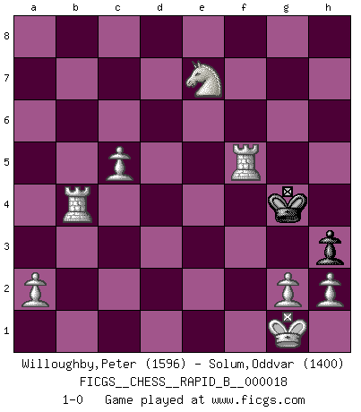 Last move : 1-0 2006 December 15 6:30:24 [Event "FICGS__CHESS__RAPID_B__000018"] [Site "FICGS"] [Date "2006.10.03"] [Round "1"] [White "Willoughby,Peter"] [Black "Solum,Oddvar"] [Result "1-0"] [WhiteElo "1596"] [BlackElo "1400"] 1.e4 e5 2.Nf3 d6 3.c3 c6 4.d4 Bd7 5.dxe5 dxe5 6.Nxe5 Be6 7.Qxd8+ Kxd8 8.Nd2 h5 9.Bc4 Nf6 10.Bxe6 fxe6 11.Nf7+ Ke7 12.Nxh8 g5 13.Ng6+ Kf7 14.Nxf8 Kxf8 15.O-O Nbd7 16.f3 Rd8 17.Nc4 Nc5 18.Bxg5 Kf7 19.Bxf6 Kxf6 20.Rad1 Rg8 21.e5+ Kg6 22.b4 Na4 23.Rd3 Kh6 24.Nd6 Nb2 25.Rd2 Rg5 26.Rxb2 Rxe5 27.Nxb7 a5 28.f4 Re3 29.Nxa5 Rxc3 30.f5 exf5 31.Rxf5 Rc1+ 32.Rf1 Rc5 33.bxc5 h4 34.Nxc6 Kg5 35.Ne7 Kg4 36.Rf5 h3 37.Rb4+ 1-0 This chess game has been lost on time (started : 2006.10.03 15:6:10) Philidor's defense Kingside Castling by player White (move 15) 10 pieces endgame at move 34 : White KRRNPPPP , Black KP WHITE : King + 2 Rooks 1 Knight 4 Pawns BLACK : King + 1 Pawn Player White won this chess game. Follow this game move after move (download)I won't play with you anymore. You have insulted my friend. - When an opponent cursed himself for a blunder. (Miguel Najdorf) Es tut gut, die Entwicklungsperiode von, [...] demokratischem Geist durchdringen zu lassen. Wie undemokratisch wäre es doch beispielsweise, den einen Offizier große Spaziertouren vornehmen zu lassen, während die anderen zu Hause säßen und sich entsetzlich langweilten. (Aaron Nimzowitsch) Si el Ajedrez es una ciencia, es la mas inexacta. Si el Ajedrez es un arte, es demasiado inexacto para ser visto como tal. Si el Ajedrez es un deporte, es demasiado esotérico. Si el Ajedrez es un juego, es demasiado exigente para ser solo un juego. Si el Ajedrez es una aventura, es una muy demandante. Si el Ajedrez es una pasión, es una muy gratificante. Si el Ajedrez es la vida, es una muy triste. (Anónimo) Vous m'avez demandé de vous exposer quel est le fondement de la prière. Je ne fais que préparer les pièces du jeu sur la table... Nous sera-t-il permis d'en adopter les règles et si nous les appliquons scrupuleusement nous ne tarderons pas à faire mat le Roi divin ! Il ne pourra échapper à nos mains. (Sainte Thérèse d'Avila, Chemin de perfection) Think like a man of action, act like a man of thought. (Henri Louis Bergson)