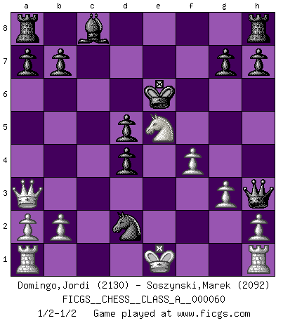 Last move : 1/2-1/2 2009 December 13 20:7:13 [Event "FICGS__CHESS__CLASS_A__000060"] [Site "FICGS"] [Date "2009.11.14"] [Round "1"] [White "Domingo,Jordi"] [Black "Soszynski,Marek"] [Result "1/2-1/2"] [WhiteElo "2130"] [BlackElo "2092"] 1.e4 e5 2.Nf3 Nc6 3.Bc4 Bc5 4.c3 Nf6 5.d4 exd4 6.cxd4 Bb4+ 7.Bd2 Nxe4 8.Bxb4 Nxb4 9.Bxf7+ Kxf7 10.Qb3+ d5 11.Ne5+ Ke6 12.Qxb4 c5 13.Qa3 cxd4 14.f4 Qh4+ 15.g3 Qh3 16.Nd2 Nxd2 1/2-1/2 Giuoco Piano This chess game ended in a draw. Follow this game move after move (download)No price is too great for the scalp of the enemy King. (Koblentz) Gewinnen beim Schach fördert das Selbstvertrauen. Beim Sex spüre ich sowas nicht... (Garry Kasparov) Solo puedes ser bueno en el Ajedrez si amas al juego. (Bobby Fischer) Je fais ceci parce que dans cinquante coups j'obtiendrai cela; je m'appelle Mikhail Moisevitch Botvinnik. (Botvinnik) Plans are ideas that never come to fruition. (Daniel Parmet)