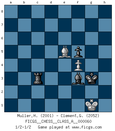 Last move : 1/2-1/2 2010 January 18 9:36:33 [Event "FICGS__CHESS__CLASS_A__000060"] [Site "FICGS"] [Date "2009.11.14"] [Round "1"] [White "Muller,Henri-Louis"] [Black "Clement,George"] [Result "1/2-1/2"] [WhiteElo "2001"] [BlackElo "2052"] 1.e4 c6 2.d4 d5 3.Nc3 dxe4 4.Nxe4 Nf6 5.Nxf6+ gxf6 6.c3 Qd5 7.Be3 Rg8 8.Ne2 e5 9.Qc2 h6 10.Ng3 Be6 11.f4 exd4 12.Bxd4 Nd7 13.f5 Rxg3 14.hxg3 Bxf5 15.Qf2 Be6 16.Be2 Bd6 17.Rh5 Qe4 18.Rxh6 O-O-O 19.O-O-O Bxg3 20.Qxg3 Qxe2 21.Qf3 Qxf3 22.gxf3 Bxa2 23.Bxf6 Re8 24.Bh4 Ne5 25.f4 Ng6 26.Bg3 Bb3 27.Rd3 Rg8 28.Rh5 Ne7 29.Rg5 Rh8 30.Re3 Kd7 31.Kd2 Be6 32.Re2 Rh1 33.Rh2 Ra1 34.Kd3 b6 35.Rd2 Ra4 36.Ke3 Kc8 37.Kf3 Nf5 38.Rh5 Ra5 39.Kf2 Ra2 40.Bh4 Kb7 41.Bf6 a5 42.Be5 a4 43.Rh8 a3 44.Rb8+ Ka7 45.R2d8 Rxb2+ 46.Ke1 c5 47.Ra8+ Kb7 48.Rxa3 Ne3 49.R3a8 Nc4 50.Rab8+ Kc6 51.Rd3 Bg4 52.Rg8 f5 53.Rg6+ Kb5 54.Bc7 Re2+ 55.Kf1 Ne3+ 56.Rxe3 Rxe3 57.Rxb6+ Kc4 58.Be5 Re2 59.Rd6 Bf3 60.Rd7 Ra2 61.Rc7 Kd3 62.Rxc5 Ke3 63.Kg1 Rg2+ 64.Kf1 Rc2 65.Kg1 Bg2 66.Ra5 Kf3 67.Ra1 Kg3 68.c4 Rxc4 69.Ra3+ Bf3 70.Rc3 Rxc3 1/2-1/2 Caro-Kann : Bronstein-Larsen variation Queenside Castling by player Black (move 18) Queenside Castling by player White (move 19) 10 pieces endgame at move 57 : White KRBPP , Black KRBPP WHITE : King + 1 Rook 1 Bishop 2 Pawns BLACK : King + 1 Rook 1 Bishop 2 Pawns 9 pieces endgame at move 62 : White KRBPP , Black KRBP WHITE : King + 1 Rook 1 Bishop 2 Pawns BLACK : King + 1 Rook 1 Bishop 1 Pawn 8 pieces endgame at move 68 : White KRBP , Black KRBP WHITE : King + 1 Rook 1 Bishop 1 Pawn BLACK : King + 1 Rook 1 Bishop 1 Pawn 7 pieces endgame at move 70 : White KBP , Black KRBP WHITE : King + 1 Bishop 1 Pawn BLACK : King + 1 Rook 1 Bishop 1 Pawn This chess game ended in a draw. Follow this game move after move (download)By this measure (on the gap between Fischer & his contemporaries), I consider him the greatest world champion. (Garry Kasparov) Wir können eben der zündenden Macht des Opfers nicht wiederstehen, denn die Begeisterung für das Opfer liegt in der Natur des Menschen. (Rudolf Spielmann) El Ajedrez hace al hombre ser mas sabio y ver mas claro. (Vladimir Putin) Je crois qu'il existe des manières très spécifiques de jouer efficacement contre une machine. Evidemment, nous n'avons aucune chance en technique pure, parce que l'ordinateur calcule de manière parfaite. Mais lorsque nous faisons appel à notre cerveau, en utilisant l'intuition et la compréhension, alors nous restons beaucoup plus forts. (Anatoli Karpov) A good teacher is like a candle - it consumes itself to light the way for others. (Author unknown)