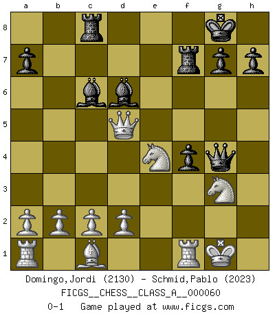 Last move : 0-1 2010 May 12 10:31:10 [Event "FICGS__CHESS__CLASS_A__000060"] [Site "FICGS"] [Date "2009.11.14"] [Round "1"] [White "Domingo,Jordi"] [Black "Schmid,Pablo"] [Result "0-1"] [WhiteElo "2130"] [BlackElo "2023"] 1.e4 e5 2.Nf3 Nc6 3.Bc4 Nf6 4.Ng5 d5 5.exd5 Na5 6.Bb5+ c6 7.dxc6 bxc6 8.Qf3 Be7 9.Bxc6+ Nxc6 10.Qxc6+ Bd7 11.Qf3 O-O 12.Nc3 Ng4 13.Nge4 f5 14.Ng3 e4 15.Qe2 Rc8 16.h3 Nxf2 17.O-O Nxh3+ 18.gxh3 Bd6 19.Qg2 Qh4 20.Nce2 f4 21.Qxe4 Qxh3 22.Qd5+ Rf7 23.Ne4 Qg4+ 24.N2g3 Bc6 0-1 Two knights defense Kingside Castling by player Black (move 11) Kingside Castling by player White (move 17) Player Black won this chess game. Follow this game move after move (download)The stomach is an essential part of the Chess master. (Bent Larsen) Deine Wertungszahl - vorausgesetzt einige Jahre schachliche Anstrengung - entspricht etwa dem zehnfachen Deines IQ plus 1000. (Jonathan Levitt) Hoy en día, si tu no eres un Gran Maestro a los 14 años, es mejor que lo olvides. (Anand Viswanathan) Horreur, mais aussi harmonie suprême : qu'y avait-il en effet au monde en dehors des échecs ? Le brouillard, l'inconnu, le non-être... (Vladimir Nabokov) The human is the only animal species whose members are able to talk themselves into difficulties that would not otherwise exist. (Wendell Johnson)
