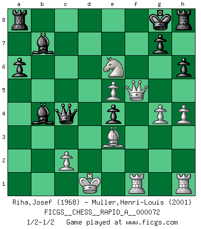 Last move : 1/2-1/2 2009 December 22 9:21:10 [Event "FICGS__CHESS__RAPID_A__000072"] [Site "FICGS"] [Date "2009.11.16"] [Round "1"] [White "Riha,Josef"] [Black "Muller,Henri-Louis"] [Result "1/2-1/2"] [WhiteElo "1968"] [BlackElo "2001"] 1.e4 c5 2.Nf3 d6 3.d4 cxd4 4.Nxd4 Nf6 5.Nc3 a6 6.Be3 e6 7.f3 b5 8.Qd2 Bb7 9.g4 h6 10.O-O-O Nbd7 11.h4 b4 12.Na4 Qa5 13.b3 Nc5 14.a3 Nxa4 15.axb4 Qc7 16.bxa4 d5 17.e5 Nd7 18.f4 Nb6 19.f5 Nxa4 20.fxe6 Nc3 21.exf7+ Kxf7 22.Bd3 Bxb4 23.Rdf1+ Kg8 24.Qf2 Ba3+ 25.Kd2 Ne4+ 26.Bxe4 dxe4 27.Qf5 Bb4+ 28.Kd1 Qc4 29.Ne6 Qd5+ 30.Ke2 Qc4+ 31.Kd1 1/2-1/2 Sicilian : Najdorf, Byrne (English) attack Queenside Castling by player White (move 10) This chess game ended in a draw. Follow this game move after move (download)All I want to do, ever, is just play Chess. (Bobby Fischer) Capablanka war das größte Genie der Schachgeschichte! Aber denken sie nicht er habe nichts vom Schach verstanden. Er wusste nur soviel wie er wissen musste um seine Ziele zu erreichen. (Mikhail Moiseyevich Botvinik) Hay dos clases de hombres: aquellos que se conforman en dejarse llevar por las circunstancias y que juegan barajas y aquellos decididos a controlar las circunstancias y que juegan al Ajedrez. (Mortimer Collins) Roi des jeux et jeu des rois, les échecs portent en eux un sentiment d'infini. Ils donnent à celui qui s'est efforcé d'en approfondir les arcanes l'impression de n'être pas à la mesure de l'homme; en fait, ils constituent un résumé de l'univers, un microcosme, et figurent cette grande échelle qui, dans les plans de la lumière descend jusqu'à la matière, qui des abîmes insondables remonte jusqu'en l'infini de Dieu. (Pyrame) Perfection is achieved, not when there is nothing more to add, but when there is nothing left to take away. (Antoine de Saint-Exupéry)