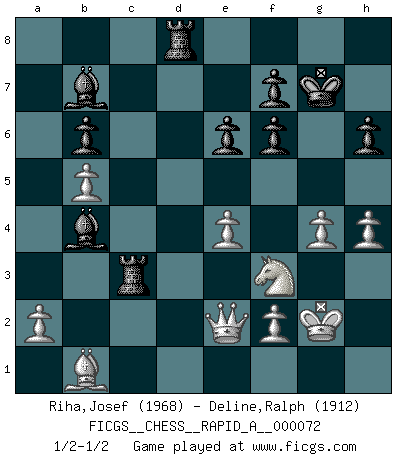 Last move : 1/2-1/2 2010 January 1 20:9:34 [Event "FICGS__CHESS__RAPID_A__000072"] [Site "FICGS"] [Date "2009.11.16"] [Round "1"] [White "Riha,Josef"] [Black "Deline,Ralph"] [Result "1/2-1/2"] [WhiteElo "1968"] [BlackElo "1912"] 1.Nf3 Nf6 2.d4 d5 3.c4 e6 4.Nc3 Be7 5.Bg5 O-O 6.e3 h6 7.Bh4 b6 8.Bd3 c5 9.dxc5 dxc4 10.Bxc4 Qc7 11.b4 bxc5 12.Bg3 Qb6 13.b5 Rd8 14.Qc2 Nh5 15.Be5 Nd7 16.O-O Bb7 17.Na4 Qa5 18.Bc3 Qc7 19.Rfd1 Nhf6 20.h3 Be4 21.Qb2 Rab8 22.Qe2 Nb6 23.Nxb6 axb6 24.Be5 Bd6 25.Bxf6 gxf6 26.Bd3 Bb7 27.e4 Rd7 28.Bc2 Rbd8 29.Rd3 c4 30.Rc3 Be5 31.Rxc4 Qxc4 32.Qxc4 Bxa1 33.Qe2 Rc8 34.Kh2 Rc5 35.h4 Bc3 36.Bb1 Ba5 37.g4 Kg7 38.Kg2 Rd8 39.Bd3 Rc3 40.Bc2 Bb4 41.Bb1 1/2-1/2 Reti Opening Kingside Castling by player Black (move 5) Kingside Castling by player White (move 16) This chess game ended in a draw. Follow this game move after move (download)Chess is a terrible game. If you have no center, your opponent has a freer position. If you do have a center, then you really have something to worry about ! (Siegbert Tarrasch) Modernes Schach erfordert enorme Anspannung. Es ist für einen normalen Menschen unmöglich das auszuhalten. (Viktor Kortschnoi) El Ajedrez es la vida. (Bobby Fischer) Aux échecs, les retours au sommet sont rares : les dommages psychologiques consécutifs à une défaite sont trop sévères. (Daily Telegraph) Memory... is the diary that we all carry with us. (Oscar Wilde, The Importance of Being Earnest)