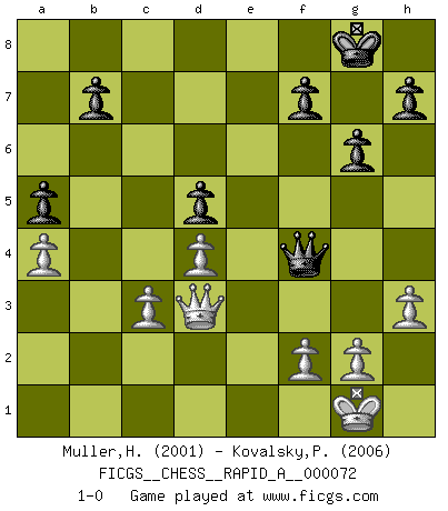 Last move : 1-0 2010 February 13 8:43:4 [Event "FICGS__CHESS__RAPID_A__000072"] [Site "FICGS"] [Date "2009.11.16"] [Round "1"] [White "Muller,Henri-Louis"] [Black "Kovalsky,Petr"] [Result "1-0"] [WhiteElo "2001"] [BlackElo "2006"] 1.e4 e5 2.Nf3 Nf6 3.Nxe5 d6 4.Nf3 Nxe4 5.d4 d5 6.Bd3 Nc6 7.O-O Be7 8.c4 Nb4 9.Be2 O-O 10.Nc3 Be6 11.Be3 Bf5 12.Rc1 dxc4 13.Bxc4 c6 14.Ne5 Nxc3 15.bxc3 Nd5 16.Qf3 Be6 17.Bd2 Re8 18.Rfe1 Bg5 19.Bxg5 Qxg5 20.Nd3 a5 21.a4 Rac8 22.Re5 Qd2 23.Bb3 g6 24.Rc2 Qh6 25.h3 Bf5 26.Rxe8+ Rxe8 27.Bxd5 cxd5 28.Re2 Rxe2 29.Qxe2 Bxd3 30.Qxd3 Qc1+ 31.Kh2 Qf4+ 32.Kg1 1-0 This chess game has been lost on time (started : 2009.11.16 12:24:40) Petrov : Classical attack Kingside Castling by player White (move 7) Kingside Castling by player Black (move 9) Player White won this chess game. Follow this game move after move (download)It is the aim of the modern school, not to treat every position according to one general law, but according to the principle inherent in the position. (Richard Reti) Lisa Lane, amerikanische Schachmeisterin, hatte Fischer einmal als stärksten lebenden Spieler bezeichnet. Antwort: Das ist richtig, aber Lisa Lane ist eigentlich nicht in der Lage, das zu beurteilen. (Robert James Fischer) El Rey es una pieza de pelea. ¡Usenlo!. (Wilhelm Steinitz) Un footballeur joue avec ses pieds, parfois avec sa tête. Un joueur d'échecs ne joue qu'avec sa tête. Et quand il ne joue plus, il meurt. (Jacob Murray) A bird doesn't sing because it has an answer, it sings because it has a song. (Maya Angelou)