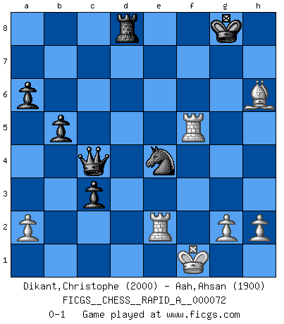 Last move : 0-1 2009 December 7 16:35:53 [Event "FICGS__CHESS__RAPID_A__000072"] [Site "FICGS"] [Date "2009.11.16"] [Round "1"] [White "Dikant,Christophe"] [Black "Aah,Ahsan"] [Result "0-1"] [WhiteElo "2000"] [BlackElo "1900"] 1.d4 d5 2.Nf3 Nf6 3.Bf4 g6 4.e3 Bg7 5.Bd3 O-O 6.Nbd2 c5 7.c3 c4 8.Bc2 Nc6 9.e4 dxe4 10.Nxe4 Nd5 11.Bg5 f5 12.Nc5 h6 13.Bd2 b6 14.Na4 b5 15.Nc5 e5 16.O-O exd4 17.cxd4 Qc7 18.Re1 Nxd4 19.Nxd4 Bxd4 20.Ne6 Bxf2+ 21.Kf1 Bxe6 22.Rxe6 Qf7 23.Re2 Bd4 24.Bxh6 Bxb2 25.Rf2 Nc3 26.Qe1 Rfe8 27.Bxf5 Rxe1+ 28.Rxe1 gxf5 29.Rxb2 a6 30.Re3 Ne4 31.Rbe2 c3 32.Rf3 Qc4 33.Rxf5 Rd8 0-1 Queen's Bishop game Kingside Castling by player Black (move 5) Kingside Castling by player White (move 16) Player Black won this chess game. Follow this game move after move (download)I play correspondence chess because it is both art and science while chess is art only. (A player at FICGS) Ich verstehe mehr vom Schach als irgendein anderer lebender Meister. (José Raúl Capablanca) El Ajedrez, como la música, como el amor, tiene el poder de hacer feliz a la gente. (Siegbert Tarrasch) Botvinnik disait en comparant les échecs à la musique: Il existe une science dont le but est l'étude de l'acoustique et des sons. Mais il y a aussi un art qui se sert de l'océan des sons : c'est la musique. De toute évidence, il en est de même pour la pensée. La logique est l'étude des lois de la réflexion et les échecs reflètent, en tant qu'art, le côté logique de la réflexion, sous la forme d'images artistiques... Extrait de Fischer - Spassky, Reykjavik 1972 par Alexander & F. Wyndham (Ed. Solar), p 37. The beginning is the most important part of the work. (Plato)