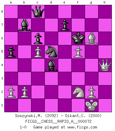 Last move : 1-0 2009 December 18 19:3:29 [Event "FICGS__CHESS__RAPID_A__000072"] [Site "FICGS"] [Date "2009.11.16"] [Round "1"] [White "Soszynski,Marek"] [Black "Dikant,Christophe"] [Result "1-0"] [WhiteElo "2092"] [BlackElo "2000"] 1.e4 d5 2.exd5 Nf6 3.Nf3 Nxd5 4.d4 g6 5.Be2 Bg7 6.O-O O-O 7.c4 Nb6 8.Nc3 Nc6 9.d5 Ne5 10.c5 Nxf3+ 11.Bxf3 Nd7 12.Be3 Ne5 13.Be2 c6 14.f4 Nd7 15.Bf3 Qc7 16.dxc6 bxc6 17.Qa4 Bb7 18.Rad1 a6 19.Rf2 Rad8 20.Rfd2 Nb8 21.Rxd8 Rxd8 22.Rxd8+ Qxd8 23.Qb3 Qc8 24.Ne4 h6 25.h4 Kf8 26.h5 a5 27.hxg6 fxg6 28.Nf2 Na6 29.Be4 Nb4 30.Bxg6 Nd5 31.Bd2 Bd4 32.f5 Kg7 33.Bxh6+ Kxh6 34.Qh3+ Kg7 35.Qh7+ Kf6 36.Qh4+ 1-0 Scandinavian defense Kingside Castling by player White (move 6) Kingside Castling by player Black (move 6) Player White won this chess game. Follow this game move after move (download)There are two types of sacrifices: correct ones and mine. (Mikhail Tal) Im Reiche der Wirklichkeit ist man nie so glücklich wie im Reiche der Gedanken. (Arthur Schopenhauer) Siempre es mucho mejor sacrificar las piezas de tu oponente. (Savielly Tartakover) Je fais ceci parce que dans cinquante coups j'obtiendrai cela; je m'appelle Mikhail Moisevitch Botvinnik. (Botvinnik) When you've done things right people won't know you've done anything at all. (Futurama)