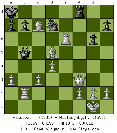 Last move : 1-0 2006 November 1 12:25:20 [Event "FICGS__CHESS__RAPID_B__000018"] [Site "FICGS"] [Date "2006.10.03"] [Round "1"] [White "Vasquez,Fernando"] [Black "Willoughby,Peter"] [Result "1-0"] [WhiteElo "1581"] [BlackElo "1596"] 1.e4 e6 2.d4 d5 3.e5 c5 4.c3 Nc6 5.Nf3 Qb6 6.a3 c4 7.Nbd2 Na5 8.Be2 Bd7 9.O-O f5 10.exf6 Nxf6 11.Ne5 Be7 12.Bh5+ g6 13.Bf3 Nc6 14.Nxd7 Nxd7 15.Re1 Na5 16.Bg4 O-O-O 17.Bxe6 Kb8 18.Bxd5 Bg5 19.Nxc4 Nxc4 20.Bxg5 Nxb2 21.Qe2 Rc8 22.Bf4+ Ka8 23.Rab1 Qd8 24.Qf3 Rb8 25.Bxb8 Qb6 26.Re6 Qb5 27.Bc7 Rf8 28.Rxb2 1-0 French : Advance, Paulsen attack Kingside Castling by player White (move 9) Queenside Castling by player Black (move 16) Player White won this chess game. Follow this game move after move (download)My opponents make good moves too. Sometimes I don't take these things into consideration. (Bobby Fischer) Konzentriere dich auf materielle Gewinne. Nimm, was dir dein Gegner gibt, ausser es gibt einen guten Grund der dagegenspricht. (Robert James Fischer) En manos de Fischer's, una diminuta ventaja teórica es tan buena como tener una Reina de ventaja. (Isaac Kashdan) Pour se monter efficace, un Cavalier a besoin d'avant-postes ! Les Cavaliers font les meilleurs bloqueurs de pions passés. They say poker is a zero-sum game. It must be, because every time I play my sum ends up zero. (Max Shapiro)