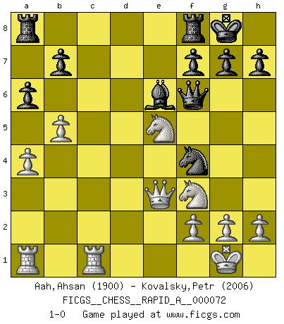 Last move : 1-0 2010 February 27 21:30:4 [Event "FICGS__CHESS__RAPID_A__000072"] [Site "FICGS"] [Date "2009.11.16"] [Round "1"] [White "Aah,Ahsan"] [Black "Kovalsky,Petr"] [Result "1-0"] [WhiteElo "1900"] [BlackElo "2006"] 1.e4 e5 2.d4 exd4 3.Nf3 Nc6 4.Nxd4 Bc5 5.Be3 Qf6 6.c3 Nge7 7.Bc4 Ne5 8.Qe2 O-O 9.O-O d6 10.Nd2 a6 11.a4 Bd7 12.b4 Ba7 13.N4f3 Nxc4 14.Nxc4 Qxc3 15.Rfc1 Qf6 16.Bxa7 Rxa7 17.e5 dxe5 18.Ncxe5 Be6 19.Rxc7 Nd5 20.R7c1 R7a8 21.b5 Nf4 22.Qe3 1-0 This chess game has been lost on time (started : 2009.11.16 12:24:40) Centre game Kingside Castling by player Black (move 8) Kingside Castling by player White (move 9) Player White won this chess game. Follow this game move after move (download)Chess is like war on a board. (Bobby Fischer) Du kannst im Schach nur gut werden, wenn du das Spiel liebst. (Robert James Fischer) El ganar no lo es todo... pero el perder es nada. (Mednis) C'est une question de caractère, Beaucoup de gens perdent leur motivation très vite. D'autres, ils sont rares, peuvent la conserver très longtemps. J'aime les échecs, encore aujourd'hui je suis heureux d'analyser des parties. J'aime toujours gagner, je déteste encore perdre. Bien jouer est important pour mon intégrité intellectuelle et morale. Et puis les échecs vivent en ce moment une période historique grâce à Internet. Ils se développent dans les systèmes éducatifs à travers le monde. Ils sortent de leur ghetto, et c'est mon rôle de mener à bien cette révolution. (Gary Kasparov) A good player is always lucky. (Capablanca)