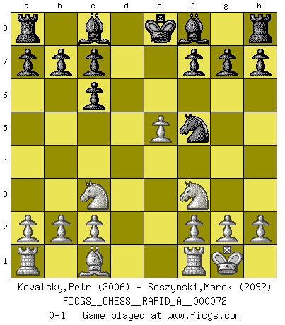 Last move : 0-1 2010 January 3 8:23:19 [Event "FICGS__CHESS__RAPID_A__000072"] [Site "FICGS"] [Date "2009.11.16"] [Round "1"] [White "Kovalsky,Petr"] [Black "Soszynski,Marek"] [Result "0-1"] [WhiteElo "2006"] [BlackElo "2092"] 1.e4 e5 2.Nf3 Nc6 3.Bb5 Nf6 4.O-O Nxe4 5.d4 Nd6 6.Bxc6 dxc6 7.dxe5 Nf5 8.Qxd8+ Kxd8 9.Nc3 Ke8 0-1 This chess game has been lost on time (started : 2009.11.16 12:24:40) Ruy Lopez : Berlin defense, Open variation Kingside Castling by player White (move 4) Player Black won this chess game. Follow this game move after move (download)Fischer Chess play was always razor-sharp, rational and brilliant. One of the best ever. (Dave Regis) Verschiedene, sehr schätzbare und im Laufe des Lebens nützliche Eigenschaften des Geistes können durch das Schachspiel erworben und gekräftigt werden, so dass sie zu Gewohnheiten werden, die uns nie im Stich lassen. (Benjamin Franklin) Cuando tu no sabes absolutamente que mas hacer, es tiempo de entrar en pánico. (John van der Wiel) J'apprécie les joueurs d'est-indienne, c'est grâce à eux que je nourris ma famille depuis tant d'années. (Petrosian) Never was anything great achieved without danger. (Niccolo Machiavelli)