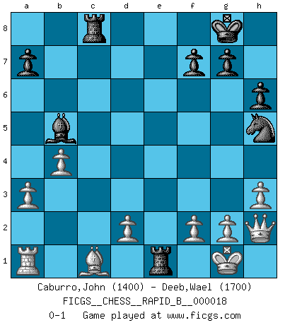 Last move : 0-1 2006 November 10 13:49:52 [Event "FICGS__CHESS__RAPID_B__000018"] [Site "FICGS"] [Date "2006.10.03"] [Round "1"] [White "Caburro,John"] [Black "Deeb,Wael"] [Result "0-1"] [WhiteElo "1400"] [BlackElo "1700"] 1.a3 e5 2.h3 d5 3.c4 c6 4.cxd5 cxd5 5.e3 Nf6 6.Nc3 d4 7.exd4 exd4 8.Qa4+ Nc6 9.Bb5 dxc3 10.Bxc6+ bxc6 11.Qxc6+ Bd7 12.Qxc3 Bd6 13.Nf3 O-O 14.O-O Rc8 15.Qd4 Bc6 16.Ne5 Bxe5 17.Qxe5 Re8 18.Qg5 h6 19.Qh4 Re4 20.Qg3 Nh5 21.Qh2 Qd3 22.b4 Qxf1+ 23.Kxf1 Bb5+ 24.Kg1 Re1+ 0-1 Anderssen's Opening Kingside Castling by player Black (move 13) Kingside Castling by player White (move 14) Player Black won this chess game. Follow this game move after move (download)Chess is a forcing house where the fruits of character can ripen more fully than in life. (Edward Morgan Foster) Wenn Du absolut nicht mehr weißt, was Du tun sollst, dann ist es Zeit für Panik. (John van der Wiel) Debemos de asegurarnos de que el Ajedrez no se convierta en un lenguaje muerto, muy interesante, pero tan solo para un grupo muy pequeño. (Sytze Faber) Assurément je connaissais par expérience le mystérieux attrait de ce jeu royal, le seul entre tous les jeux inventés par les hommes qui échappe souverainement à la tyrannie du hasard, le seul où l'on ne doive sa victoire qu'à son intelligence ou plutôt à une certaine forme d'intelligence. Mais n'est-ce pas déjà le limiter injurieusement que d'appeler les échecs un jeu ? N'est-ce pas une science, un art ou quelque chose qui, comme le cercueil de Mahomet entre ciel et terre, est suspendu entre l'un et l'autre, et qui réunit un nombre incroyable de contraires ? [...] C'est une pensée qui ne mène à rien, une mathématique qui n'établit rien, un art qui ne laisse pas d'uvre, une architecture sans matière; et il l'a prouvé néanmoins qu'il était plus durable, à sa manière, que les livres ou que tout autre monument, ce jeu unique qui appartient à tous les peuples et à tous les temps, et dont personne ne sait quel dieu en fit don à la terre pour tuer l'ennui, pour aiguiser l'esprit et stimuler l'âme. Où commence-t-il, où finit-il ? (Stefan Zweig) The Internet is so big, so powerful and pointless that for some people it is a complete substitute for life. (Andrew Brown)
