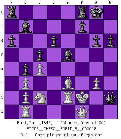 Last move : 0-1 2006 October 25 22:21:30 [Event "FICGS__CHESS__RAPID_B__000018"] [Site "FICGS"] [Date "2006.10.03"] [Round "1"] [White "Putt,Tom"] [Black "Caburro,John"] [Result "0-1"] [WhiteElo "1642"] [BlackElo "1400"] 1.e4 g6 2.d4 Bg7 3.Nf3 d6 4.Bc4 a6 5.Ng5 e6 6.O-O Ne7 7.Re1 O-O 8.c3 b5 9.Bb3 h6 10.Nf3 Bb7 11.d5 exd5 12.exd5 Nd7 13.Na3 Nc5 14.Be3 Nxb3 15.axb3 Nxd5 16.Bd4 Nf6 17.c4 c5 18.Be3 b4 19.Nc2 Ng4 20.Rb1 Ne5 21.Nxe5 Bxe5 22.Re2 Qh4 23.g3 Qe4 24.f3 Qxf3 25.Qf1 Qh1+ 26.Kf2 Qxh2+ 0-1 Robatsch (Modern) defense Kingside Castling by player White (move 6) Kingside Castling by player Black (move 7) Player Black won this chess game. Follow this game move after move (download)When you play Bobby, it is not a question if you win or lose. It is a question if you survive. (Boris Spassky) Capablanka war das größte Genie der Schachgeschichte! Aber denken sie nicht er habe nichts vom Schach verstanden. Er wusste nur soviel wie er wissen musste um seine Ziele zu erreichen. (Mikhail Moiseyevich Botvinik) El Ajedrez es sobre todo, ¡una pelea!. (Emanuel Lasker) Un footballeur joue avec ses pieds, parfois avec sa tête. Un joueur d'échecs ne joue qu'avec sa tête. Et quand il ne joue plus, il meurt. (Jacob Murray) You have to believe in yourself. (Sun Tzu)