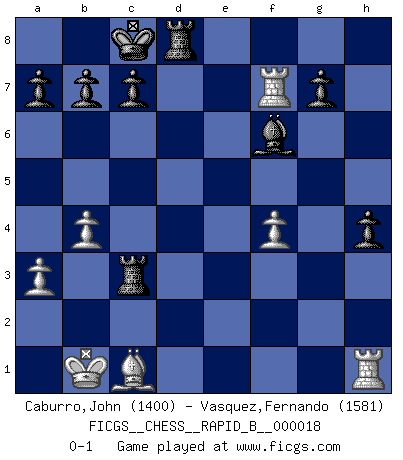 Last move : 0-1 2006 December 26 1:36:37 [Event "FICGS__CHESS__RAPID_B__000018"] [Site "FICGS"] [Date "2006.10.03"] [Round "1"] [White "Caburro,John"] [Black "Vasquez,Fernando"] [Result "0-1"] [WhiteElo "1400"] [BlackElo "1581"] 1.a3 e5 2.h3 d5 3.c4 dxc4 4.e3 Be6 5.Qc2 Nc6 6.Bxc4 Bxc4 7.Qxc4 Qg5 8.Qg4 Qxg4 9.hxg4 Nf6 10.g5 Ne4 11.Nf3 Nc5 12.Nc3 e4 13.Nd4 Nxd4 14.exd4 Nd3+ 15.Ke2 O-O-O 16.Nxe4 Rxd4 17.Ke3 Rxe4+ 18.Kxd3 Rg4 19.g3 Rxg5 20.Kc2 Rc5+ 21.Kb3 Rf5 22.f4 Bc5 23.d3 Rd5 24.Kc2 h5 25.b4 Bd4 26.Rb1 Re8 27.Bd2 Re2 28.Rhe1 Rg2 29.Re8+ Rd8 30.Re7 Rxg3 31.Rxf7 Bf6 32.Rh1 Rgxd3 33.Bc1 Rc3+ 34.Kb1 h4 0-1 Anderssen's Opening Queenside Castling by player Black (move 15) Player Black won this chess game. Follow this game move after move (download)Chess is a cold bath for the mind. (Sir John Simon) Rubinstein ist ein Turmendspiel, welches die Götter vor tausenden von Jahren begannen. (Savielly Grigorievitsch Tartakower) Sin errores no puede haber brillantez. (Emanuel Lasker) Dans le domaine de la peinture, de la gravure et de la sculpture, dès la première décennie de notre siècle, les artistes abandonnent la représentation de la partie d'échecs pour se concentrer sur les pièces, sur les échiquiers et sur toutes les variations auxquelles les unes et les autres peuvent donner lieu. On passe en quelque sorte d'un thème social à un thème musical (au sens de la musica médiévale, c'est-à-dire d'une notion qui inclue le rythme, l'harmonie, la construction et la déconstruction, etc.). Graphiquement et picturalement, l'échiquier apparaît comme une structure ouverte, dynamique, d'une richesse infinie, autorisant toutes les combinatoires et débouchant sur des mouvements et des rythmes de nature exponentielle. (Michel Pastoureau) The mind is like a parachute, it only functions when its open. (Unknown)