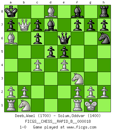Last move : 1-0 2006 October 22 8:59:57 [Event "FICGS__CHESS__RAPID_B__000018"] [Site "FICGS"] [Date "2006.10.03"] [Round "1"] [White "Deeb,Wael"] [Black "Solum,Oddvar"] [Result "1-0"] [WhiteElo "1700"] [BlackElo "1400"] 1.e4 e5 2.Nf3 d6 3.d4 Nc6 4.Bb5 Bd7 5.O-O Qf6 6.d5 O-O-O 7.dxc6 bxc6 8.Ba6+ Kb8 9.Bg5 Qe6 10.Bxd8 Nh6 11.c4 d5 12.Qb3+ Ka8 13.Qb7+ 1-0 Philidor's defense Kingside Castling by player White (move 5) Queenside Castling by player Black (move 6) Player White won this chess game. Follow this game move after move (download)The hallmark of the artist is simplicity. (Larry Evans) Sie bekommen vielleicht den Eindruck, dass die Spitzenspieler überhaupt gar nicht so stark sind. Aber das stimmt nicht. Es ist eine Illusion. Mit einem Computer an der Seite ist es sehr leicht, Urteile zu fällen, aber wenn man alleine am Brett sitzt, sieht die Sache ganz anders aus. (Vladimir Kramnik) Debió haber existido una vez en que los hombres eran semidióses, de otra manera no hubiesen podido inventar el Ajedrez. (Gustav Schenk) Je fais ceci parce que dans cinquante coups j'obtiendrai cela; je m'appelle Mikhail Moisevitch Botvinnik. (Botvinnik) The meaning of life is that it is to be lived, and it is not to be traded and conceptualized and squeezed into a pattern of systems. (Bruce Lee)