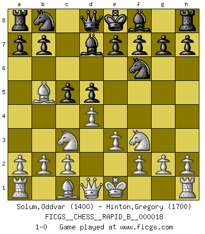 Last move : 1-0 2006 November 6 21:24:21 [Event "FICGS__CHESS__RAPID_B__000018"] [Site "FICGS"] [Date "2006.10.03"] [Round "1"] [White "Solum,Oddvar"] [Black "Hinton,Gregory"] [Result "1-0"] [WhiteElo "1400"] [BlackElo "1700"] 1.d4 Nf6 2.e3 c5 3.Nc3 d5 4.Bb5+ Bd7 5.Nf3 1-0 This chess game has been lost on time (started : 2006.10.03 15:6:10) Queen's pawn game Player White won this chess game. Follow this game move after move (download)Though most people love to look at the games of the great attacking masters, some of the most successful players in history have been the quiet positional players. They slowly grind you down by taking away your space, tying up your pieces, and leaving you with virtually nothing to do ! (Yasser Seirawan) Ein Buch ist ein Spiegel; wenn ein Affe hineinsieht, so kann kein Apostel heraus gucken. (Georg Christoph Lichtenberg) Cuando tengo las piezas blancas, yo gano porque soy blanco; Cuando tengo las piezas negras, yo gano porque soy Bogolyubov. (Bogolyubov) Comme les marins qui ont mille raisons différentes d'aller en mer, les joueurs d'échecs en ont tout autant avant de s'installer devant une table et jouer... (Vincent Bertignac, philosophe) Art disturbs, science reassures. (Georges Braque, Le Jour et la Nuit)