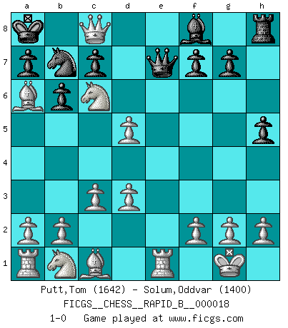 Last move : 1-0 2006 October 12 0:21:31 [Event "FICGS__CHESS__RAPID_B__000018"] [Site "FICGS"] [Date "2006.10.03"] [Round "1"] [White "Putt,Tom"] [Black "Solum,Oddvar"] [Result "1-0"] [WhiteElo "1642"] [BlackElo "1400"] 1.e4 e5 2.Nf3 d6 3.Bc4 Be6 4.Bxe6 Nf6 5.Bc4 Qe7 6.d3 Nc6 7.O-O O-O-O 8.c3 d5 9.exd5 Na5 10.Qa4 b6 11.Re1 Ng4 12.Ba6+ Nb7 13.Qxg4+ Rd7 14.Nxe5 h5 15.Qxd7+ Kb8 16.Nc6+ Ka8 17.Qc8+ 1-0 Philidor's defense Kingside Castling by player White (move 7) Queenside Castling by player Black (move 7) Player White won this chess game. Follow this game move after move (download)Dazzling combinations are for the many, shifting wood is for the few. (Georg Kieninger) Später, ... hatte ich zunehmend Erfolg in entscheidenden Partien. Vielleicht weil ich eine einfache Wahrheit erkannte: nicht nur ich hatte Angst, auch mein Gegner. (Mikhail Nekhemyevich Tal) El Ajedrez es tortura mental. (Garry Kasparov) Des combinaisons [dans le jeu d'échecs] pareilles à des mélodies. Je crois entendre pour ainsi dire la musique des coups... (Vladimir Nabokov) Lottery : A tax on people who are bad at math. (Author unknown)