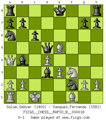 Last move : 0-1 2006 December 15 0:28:19 [Event "FICGS__CHESS__RAPID_B__000018"] [Site "FICGS"] [Date "2006.10.03"] [Round "1"] [White "Solum,Oddvar"] [Black "Vasquez,Fernando"] [Result "0-1"] [WhiteElo "1400"] [BlackElo "1581"] 1.d4 d5 2.Nc3 Nf6 3.Bf4 Bf5 4.Nb5 Na6 5.c4 dxc4 6.Qa4 c6 7.Na3 e5 8.Bxe5 Bb4+ 9.Kd1 Ne4 10.Nxc4 Nxf2+ 11.Kc1 Nxh1 12.Nf3 f6 13.Bf4 Nf2 14.e3 Qd5 15.Nce5 fxe5 16.Bxe5 Bd3 0-1 This chess game has been lost on time (started : 2006.10.03 15:6:10) Queen's pawn : Chigorin variation Player Black won this chess game. Follow this game move after move (download)Could we look into the head of a Chess player, we should see there a whole world of feelings, images, ideas, emotion and passion. (Alfred Binet) Charakterschwächen offenbaren sich normalerweise während einer Schachpartie. (Garry Kasparov) El Ajedrez es un expediente tonto que hace creer a la gente inactiva que hacen una cosa muy astuta cuando solamente estan perdiendo su tiempo. (George Bernard Shaw) Shah mat. Le roi est mort. Cri de fierté d'un joueur venant de terrasser son adversaire, courtoisement, sans effusion de sang. Are you threatening me, Master Jedi ? (Chancellor Palpatine in Star Wars ep.3)