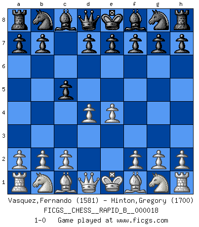 Last move : 1-0 2006 November 4 8:57:42 [Event "FICGS__CHESS__RAPID_B__000018"] [Site "FICGS"] [Date "2006.10.03"] [Round "1"] [White "Vasquez,Fernando"] [Black "Hinton,Gregory"] [Result "1-0"] [WhiteElo "1581"] [BlackElo "1700"] 1.e4 c5 2.d4 1-0 This chess game has been lost on time (started : 2006.10.03 15:6:10) Sicilian : Smith-Morra gambit Player White won this chess game. Follow this game move after move (download)Not all artists are Chess players, but all Chess players are artists. (Marcel Duchamp) Ich rechne überhaupt nicht voraus. Ich gewinne auch so. (Robert James Fischer) Muchos jugadores de Ajedrez se sorprendían cuando después de la partida, Fischer explicaba con calma: 'Yo ya había analizado esta posibilidad' en una posición en la cual yo creía que no era posible de prever desde la apertura. (Mikhail Tal) Roi des jeux et jeu des rois, les échecs portent en eux un sentiment d'infini. Ils donnent à celui qui s'est efforcé d'en approfondir les arcanes l'impression de n'être pas à la mesure de l'homme; en fait, ils constituent un résumé de l'univers, un microcosme, et figurent cette grande échelle qui, dans les plans de la lumière descend jusqu'à la matière, qui des abîmes insondables remonte jusqu'en l'infini de Dieu. (Pyrame) Beta. Software undergoes beta testing shortly before it's released. Beta is latin for still doesn't work. (Anonymous)
