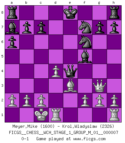 Last move : 0-1 2010 January 7 8:30:53 [Event "FICGS__CHESS__WCH_STAGE_1_GROUP_M_01__000007"] [Site "FICGS"] [Date "2009.11.17"] [Round "1"] [White "Meyer,Mike"] [Black "Krol,Wladyslaw"] [Result "0-1"] [WhiteElo "1600"] [BlackElo "2326"] 1.e4 e5 2.Nf3 Nc6 3.Bb5 a6 4.Bc4 Bc5 5.Nxe5 Nxe5 6.Bxf7+ Nxf7 7.d4 Ba7 8.Be3 d5 9.Nc3 dxe4 10.Nxe4 Qe7 11.Qf3 Nf6 12.O-O-O Qxe4 13.Qg3 Bf5 0-1 This chess game has been lost on time (started : 2009.11.17 23:14:17) Ruy Lopez (Spanish Opening) Queenside Castling by player White (move 12) Player Black won this chess game. Follow this game move after move (download)When you see a good move, look for a better one. (Emanuel Lasker) Wenn Capablanka heute auf der Schachbühne erscheinen würde, hätte er ein halbes Jahr gebraucht um sich die Schachtheorie anzueignen. Und dann hätte er alles und jeden besiegt. (Mikhail Moiseyevich Botvinik) Hay dos clases de hombres: aquellos que se conforman en dejarse llevar por las circunstancias y que juegan barajas y aquellos decididos a controlar las circunstancias y que juegan al Ajedrez. (Mortimer Collins) Aidez vos pièces, elles vous aideront. (Paul Morphy) There are two kinds of people in the world, my friend. Those who have a loaded gun and those who dig. You dig ! (Blondie in The Good, The Bad and The Ugly)