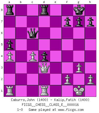 Last move : 1-0 2007 February 15 16:26:34 [Event "FICGS__CHESS__CLASS_E__000016"] [Site "FICGS"] [Date "2006.10.04"] [Round "1"] [White "Caburro,John"] [Black "Kalip,Fatih"] [Result "1-0"] [WhiteElo "1400"] [BlackElo "1400"] 1.a3 e5 2.c4 Nf6 3.Nc3 Nc6 4.g3 d6 5.Bg2 Bd7 6.b4 Be7 7.Nf3 O-O 8.O-O a5 9.b5 Nd4 10.Nxd4 exd4 11.Ne4 c6 12.a4 d5 13.Nxf6+ Bxf6 14.bxc6 Bxc6 15.d3 dxc4 16.Bxc6 bxc6 17.dxc4 Re8 18.Qd3 Qd7 19.Bd2 c5 20.e3 Qc6 21.exd4 Bxd4 22.Bc3 Red8 23.Bxd4 cxd4 24.Rfd1 1-0 This chess game has been lost on time (started : 2006.10.04 9:7:59) Anderssen's Opening Kingside Castling by player Black (move 7) Kingside Castling by player White (move 8) Player White won this chess game. Follow this game move after move (download)Chess is no whit inferior to the violin, and we have a large number of professional violinists. (Mikhail Botvinnik) Im Schach nämlich geht es darum, daß Ich des Gegners klein zu kriegen, sein Ego zu zerbrechen und zu zermahlen, seine Selbstachtung zu zertreten und zu verscharren und seine ganze mißachtenswerte sogenannte Persönlichkeit ein für alle Mal tot zu hacken und zu zerstampfen und dadurch die menschliche Gesellschaft von einer stinkenden Pestbeule zu befreien. Es ist ein königliches Spiel. (Robert James Fischer) El Ajedrez no es como la vida... ¡tiene reglas!. (Mark Pasternak) Votre seul travail dans les ouvertures est d'obtenir un milieu de partie jouable. (Lajos Portish) If only faces could talk... (Pat Summerall, Sportscaster during the Super Bowl)
