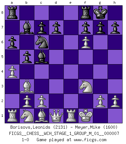 Last move : 1-0 2009 December 5 19:53:16 [Event "FICGS__CHESS__WCH_STAGE_1_GROUP_M_01__000007"] [Site "FICGS"] [Date "2009.11.17"] [Round "1"] [White "Borisovs,Leonids"] [Black "Meyer,Mike"] [Result "1-0"] [WhiteElo "2131"] [BlackElo "1600"] 1.e4 e5 2.Nf3 Nc6 3.Bb5 Nf6 4.O-O Nxe4 5.d4 a6 6.Ba4 Be7 7.Re1 Nxf2 8.Kxf2 b5 9.Bb3 O-O 10.dxe5 Bb7 11.a4 Bc5+ 12.Kf1 Qf6 13.exf6 1-0 Ruy Lopez : Berlin defense, Rosenthal variation Kingside Castling by player White (move 4) Kingside Castling by player Black (move 9) Player White won this chess game. Follow this game move after move (download)I guess a certain amount of temperament is expected of Chess geniuses. (Ron Gross) Wie bekannt hörte Morphy 1859 auf, Schach zu spielen. Seine Enttäuschung galt nicht so sehr dem Schach, wie den Schachspielern. (Robert James Fischer) El Ajedrez es tan interesante por sí solo, que no es necesario un interés monetario para persuadir a una persona a que lo practique; por lo tanto, nunca se juega por dinero. (Benjamin Franklin) Je fais ceci parce que dans cinquante coups j'obtiendrai cela; je m'appelle Mikhail Moisevitch Botvinnik. (Botvinnik) If you lose the game you should win the analysis! (Proverb)