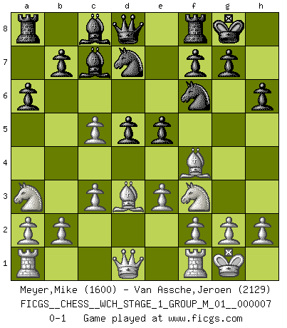 Last move : 0-1 2010 January 13 20:16:42 [Event "FICGS__CHESS__WCH_STAGE_1_GROUP_M_01__000007"] [Site "FICGS"] [Date "2009.11.17"] [Round "1"] [White "Meyer,Mike"] [Black "Van Assche,Jeroen"] [Result "0-1"] [WhiteElo "1600"] [BlackElo "2129"] 1.d4 Nf6 2.Nc3 d5 3.Bg5 Nbd7 4.Nf3 h6 5.Bf4 e6 6.Nb5 Bb4+ 7.c3 Ba5 8.e3 a6 9.Na3 O-O 10.Bd3 c5 11.O-O Bc7 12.dxc5 e5 0-1 This chess game has been lost on time (started : 2009.11.17 23:14:17) Queen's pawn game Kingside Castling by player Black (move 9) Kingside Castling by player White (move 11) Player Black won this chess game. Follow this game move after move (download)Man is a frivolous, a specious creature, and like a Chess player, cares more for the process of attaining his goal than for the goal itself. (Dostoyevsky) Es macht mich traurig, wenn ich sehe, dass Golfprofis mehr verdienen als Schachsportler. Obwohl ich davon überzeugt bin, dass wir Schachspieler viel härter trainieren müssen als die Golfer. (Alexandra Kosteniuk) ¿Quién es tu oponente esta tarde? Esta tarde mi oponente son las piezas negras. (Akiba Rubinstein) En blitz, le Cavalier l'emporte sur le Fou. (Vlastimil Hort) To steal ideas from one person is plagiarism. To steal from many is research. (Unknown)