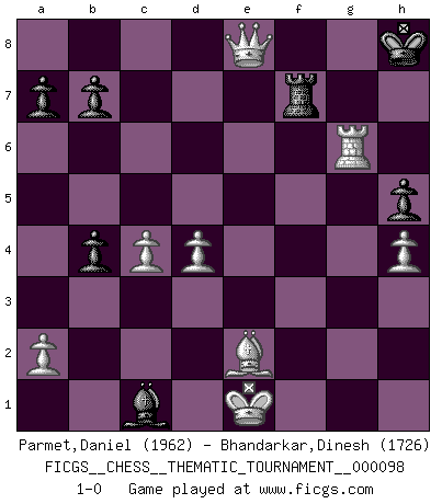 Last move : 1-0 2010 February 16 5:25:29 [Event "FICGS__CHESS__THEMATIC_TOURNAMENT__000098"] [Site "FICGS"] [Date "2009.11.18"] [Round "1"] [White "Parmet,Daniel"] [Black "Bhandarkar,Dinesh"] [Result "1-0"] [WhiteElo "1962"] [BlackElo "1726"] 1.d4 Nf6 2.c4 g6 3.Nc3 d5 4.cxd5 Nxd5 5.e4 Nxc3 6.bxc3 c5 7.Be3 Bg7 8.Qd2 O-O 9.Nf3 Qa5 10.Rc1 Bg4 11.d5 Bxf3 12.gxf3 Nd7 13.h4 h5 14.f4 Rad8 15.c4 Qa4 16.e5 Bh6 17.Rg1 Kh8 18.e6 Nf6 19.exf7 Ng4 20.Be2 Nxe3 21.Rxg6 Bxf4 22.Qc3+ e5 23.dxe6 Rd4 24.fxe3 Qb4 25.exd4 Bxc1 26.Qxb4 cxb4 27.e7 Rxf7 28.e8Q+ 1-0 King's Indian defense, 3.Nc3 Kingside Castling by player Black (move 8) Promotion Queen by player White (move 28) Player White won this chess game. Follow this game move after move (download)Those who say they understand Chess, understand nothing. (Robert Hubner) Obendrein hat der FIDE-Präsident den Revolutionsführer Gaddafi zum »Großmeister« ernannt, am Ende der WM. Das ist lächerlich! (Joel Lautier) La belleza de un movimiento no se refleja solo en su apariencia, sino en el pensamiento detrás de él. (Siegbert Tarrasch) Aidez vos pièces, elles vous aideront. (Paul Morphy) Is not life a hundred times too short to bore ourselves ? (Friedrich Nietzsche)