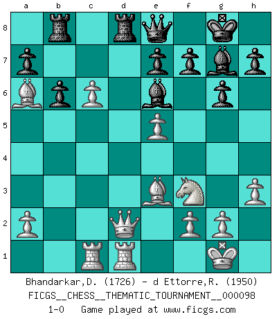 Last move : 1-0 2009 December 6 6:51:39 [Event "FICGS__CHESS__THEMATIC_TOURNAMENT__000098"] [Site "FICGS"] [Date "2009.11.18"] [Round "1"] [White "Bhandarkar,Dinesh"] [Black "d Ettorre,Rodolfo"] [Result "1-0"] [WhiteElo "1726"] [BlackElo "1950"] 1.d4 Nf6 2.c4 g6 3.Nc3 d5 4.cxd5 Nxd5 5.e4 Nxc3 6.bxc3 c5 7.Nf3 Bg7 8.Be3 Bg4 9.Be2 Nc6 10.e5 cxd4 11.cxd4 O-O 12.O-O Qd7 13.Qd2 Rfd8 14.Rfd1 Rac8 15.Rac1 b6 16.h3 Be6 17.Ba6 Rb8 18.d5 Qe8 19.dxc6 1-0 King's Indian defense, 3.Nc3 Kingside Castling by player Black (move 11) Kingside Castling by player White (move 12) Player White won this chess game. Follow this game move after move (download)Chess, like love, is infectious at any age. (Flohr) Mein erstes Ziel war nicht, die Partie zu gewinnen, sondern eine Figur zu opfern. -- der junge (Wilhelm Steinitz) Fischer era un maestro de claridad y un Rey del posicionamiento astuto. Sus oponentes podían ver hacia donde se dirigía pero eran impotentes para detenerlo. (Bruce Pandolfini) On croit qu'il y a plus de mauvais joueurs que de bons joueurs, c'est faux : Il y a autant de joueurs qui gagnent que de joueurs qui perdent. (Philippe Geluck) When you've done things right people won't know you've done anything at all. (Futurama)