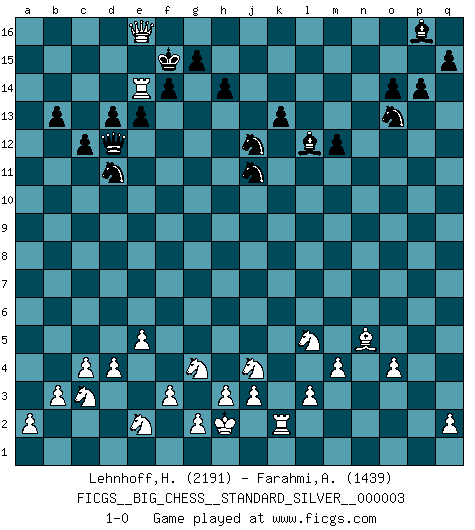 Last move : 1-0 2010 August 23 10:44:13 [Event "FICGS__BIG_CHESS__STANDARD_SILVER__000003"] [Site "FICGS"] [Date "2009.11.20"] [Round "1"] [White "Lehnhoff,Heinz-Georg"] [Black "Farahmi,Andi"] [Result "1-0"] [WhiteElo "2191"] [BlackElo "1439"] 1.j2-k4 h15-g13 2.m2-m4 j15-k13 3.e2-e4 m15-m13 4.d2-d4 e15-e13 5.b1-a3 d15-d13 6.f1-b5 n15-n13 7.n2-n4 h16-o10 8.h2-g4 b16-c14 9.c1-h6 o10-b10 10.c2-c4 p16-q14 11.p1-q3 f16-c13 12.o1-j6 o16-g9 13.l2-l3 l16-o13 14.l1-p5 k16-h15 15.f2-f3 c16-k9 16.k1-h2 o15-o14 17.h1-p8 q16-p16 18.e1-e3 g9-h8 19.g1-e2 g16-j15 20.e3-b3 b10-j10 21.o2-o4 o13-m11 22.p8-q8 c13-b14 23.b5-f9 j15-h13 24.f9-g8 j10-g10 25.k4-m5 k9-j8 26.q1-n1 h8-m12 27.q8-p7 a16-b16 28.g8-f9 g10-h10 29.a1-d1 m12-l11 30.p7-d7 b14-h8 31.m1-m3 c14-d12 32.h2-j4 b15-b14 33.d7-c6 c15-c13 34.p5-o6 h13-g11 35.f9-g8 m11-l12 36.c6-a8 h10-g10 37.m3-p3 b16-a16 38.o6-n5 g13-e12 39.m5-l7 j8-n4 40.l7-k9 h8-g7 41.k9-l11 g7-l11 42.q3-o2 n4-h9 43.g8-h7 n13-n12 44.o2-m3 q14-o13 45.m3-l5 h9-p2 46.e4-e5 p2-h9 47.j1-h2 p15-p14 48.n1-p1 l11-k12 49.p3-p10 g10-h11 50.h6-g7 m13-m12 51.h7-n12 p16-n16 52.n12-e4 n16-n13 53.p10-q10 m16-m15 54.b3-b10 m15-n15 55.b2-b3 j16-j15 56.a3-b5 e16-n16 57.g7-j9 n13-n8 58.a8-a10 c13-c12 59.j6-m9 n8-f8 60.j9-h10 f8-f12 61.h10-k12 f12-k12 62.n5-h10 k13-j11 63.h10-n5 h15-g13 64.m9-j6 e12-c11 65.a10-a9 n15-n9 66.a9-d6 n16-n15 67.n5-p7 k12-k9 68.e4-k9 n9-k9 69.j6-l8 k9-k2 70.j4-k2 h11-l8 71.d6-j11 d12-e10 72.p7-n5 g11-h13 73.j11-j9 e10-f12 74.k2-j4 f15-f14 75.d1-k1 k15-k13 76.k1-k8 l8-o11 77.b10-o10 o11-d11 78.p1-k1 g13-j12 79.k1-k2 a16-n16 80.k8-k6 h9-e12 81.q10-q6 d11-p11 82.o10-q10 n15-n9 83.j9-l7 l12-p16 84.q10-q11 p11-o12 85.q11-c11 o12-d2 86.l7-l15 j15-h16 87.b5-c3 d2-m10 88.c11-c6 m10-b10 89.q6-n6 n9-n6 90.k6-n6 n16-j16 91.c6-b6 b10-d12 92.b6-a6 a15-a13 93.n6-b6 f12-d11 94.a6-a13 h16-g16 95.a13-a16 g16-f15 96.a16-j16 e12-j16 97.l15-l16 j16-m13 98.l16-j14 h13-j11 99.b6-a6 b14-b13 100.a6-a16 m13-l12 101.j14-j16 f15-e14 102.j16-c16 e14-d14 103.a16-a14 d14-e15 104.a14-e14 e15-f15 105.c16-e16 1-0 This big chess game has been lost on time (started : 2009.11.20 12:50:7) Follow this game move after move (download)Fischer is under obligation to nobody. (Joseph Platz) Ein Kibitz ist einer, der deinem Gegner gute Ratschläge gibt. (Andrew Soltis) Durante una competencia de Ajedrez, un Maestro de Ajedrez deberá ser una combinación de presa de caza y un Monge. (Alexander Alekhine) Mon pion favori sur ma case favorite ! Bronstein en parlant d'un coup de pion en h5 quand il avait les Noirs. Art is the only way to run away without leaving home. (Twyla Tharp)