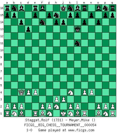 Last move : 1-0 2010 January 8 8:34:7 [Event "FICGS__BIG_CHESS__TOURNAMENT__000054"] [Site "FICGS"] [Date "2009.11.20"] [Round "1"] [White "Staggat,Rolf"] [Black "Meyer,Mike"] [Result "1-0"] [WhiteElo "1731"] [BlackElo ""] 1.j2-k4 j15-k13 2.h1-o7 h16-l13 3.o7-f15 g16-f14 4.f15-c12 c15-c14 5.n2-n4 d15-d13 6.c12-c4 o15-o14 7.m2-m4 k13-l11 8.d2-d4 m15-m14 9.e2-e4 1-0 This big chess game has been lost on time (started : 2009.11.20 14:41:44) Follow this game move after move (download)Best by test: 1. e4 (Bobby Fischer) Was ist der Unterschied zwischen einem Strassenarbeiter und einem Schachspieler? --Der Schachspieler bewegt sich ab und zu. (Anonymous) Tu no necesitas jugar muy bien, únicamente ayudar a tu oponenet a que juegue muy mal. (Genrikh Chepukaitis) C'est la seule position que je connaisse où les deux camps sont mals. Propos prêtés à V. Anand. To steal ideas from one person is plagiarism. To steal from many is research. (Unknown)