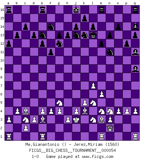 Last move : 1-0 2010 April 21 4:21:51 [Event "FICGS__BIG_CHESS__TOURNAMENT__000054"] [Site "FICGS"] [Date "2009.11.20"] [Round "1"] [White "Me,Gianantonio"] [Black "Jerez,Miriam"] [Result "1-0"] [WhiteElo ""] [BlackElo "1560"] 1.g2-g4 c15-c14 2.b1-c3 o15-o14 3.n2-n3 l15-l14 4.g1-f3 f15-f13 5.e2-e4 e15-e13 6.f1-c4 m15-m13 7.d2-d3 n15-n13 8.p1-o3 p16-n15 9.k1-l3 g15-g13 10.m2-m4 f13-f12 11.l1-m2 d15-d13 12.o1-m3 h14-h13 13.h1-g2 l16-q11 14.c1-e3 c16-m7 15.j3-j4 b16-d15 16.k2-k4 f16-b12 17.k4-k5 n15-o13 18.l3-n4 e13-e12 19.m2-b12 a15-a13 20.b12-k4 d15-f16 21.q2-q3 b15-b13 22.l2-l4 a13-a12 23.j2-l3 f16-g14 24.l4-l5 m13-m12 25.j1-j2 q15-q13 26.f3-g5 g16-f14 27.l5-l6 m7-n6 28.m4-m5 n6-q9 29.h2-k3 p15-p13 30.j2-j3 f14-g12 31.f2-f4 o16-q14 32.p2-p4 p13-p12 33.o3-m4 j15-k13 34.m5-m6 h16-l13 35.k3-l5 o13-n11 36.o2-o4 f12-f11 37.a2-a3 h15-j13 38.b2-b4 k16-h15 39.l6-l7 h15-f14 40.q3-q4 g14-e13 41.g2-n2 1-0 Follow this game move after move (download)I guess a certain amount of temperament is expected of Chess geniuses. (Ron Gross) Im Reiche der Wirklichkeit ist man nie so glücklich wie im Reiche der Gedanken. (Arthur Schopenhauer) En un gambito tu regalas un Peón por el bién de tomar un juego perdido. (Samuel Standige Boden) On croit qu'il y a plus de mauvais joueurs que de bons joueurs, c'est faux : Il y a autant de joueurs qui gagnent que de joueurs qui perdent. (Philippe Geluck) The good fighters of old first put themselves beyond the possibility of defeat, and then waited for an opportunity of defeating the enemy. (Sun Tzu)